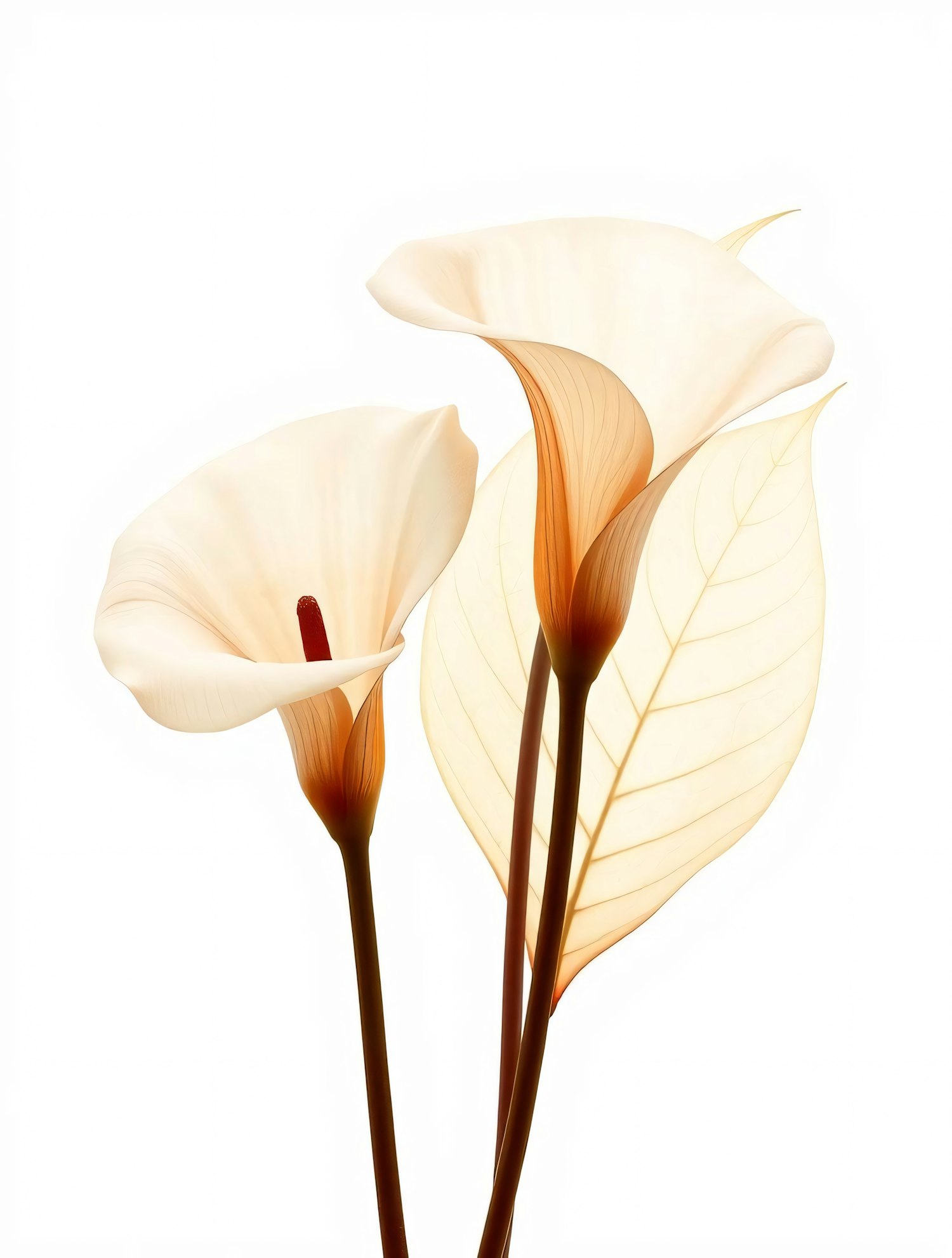 Elegant calla lilies with creamy petals and translucent leaves on a white background, showcasing their delicate and graceful beauty.