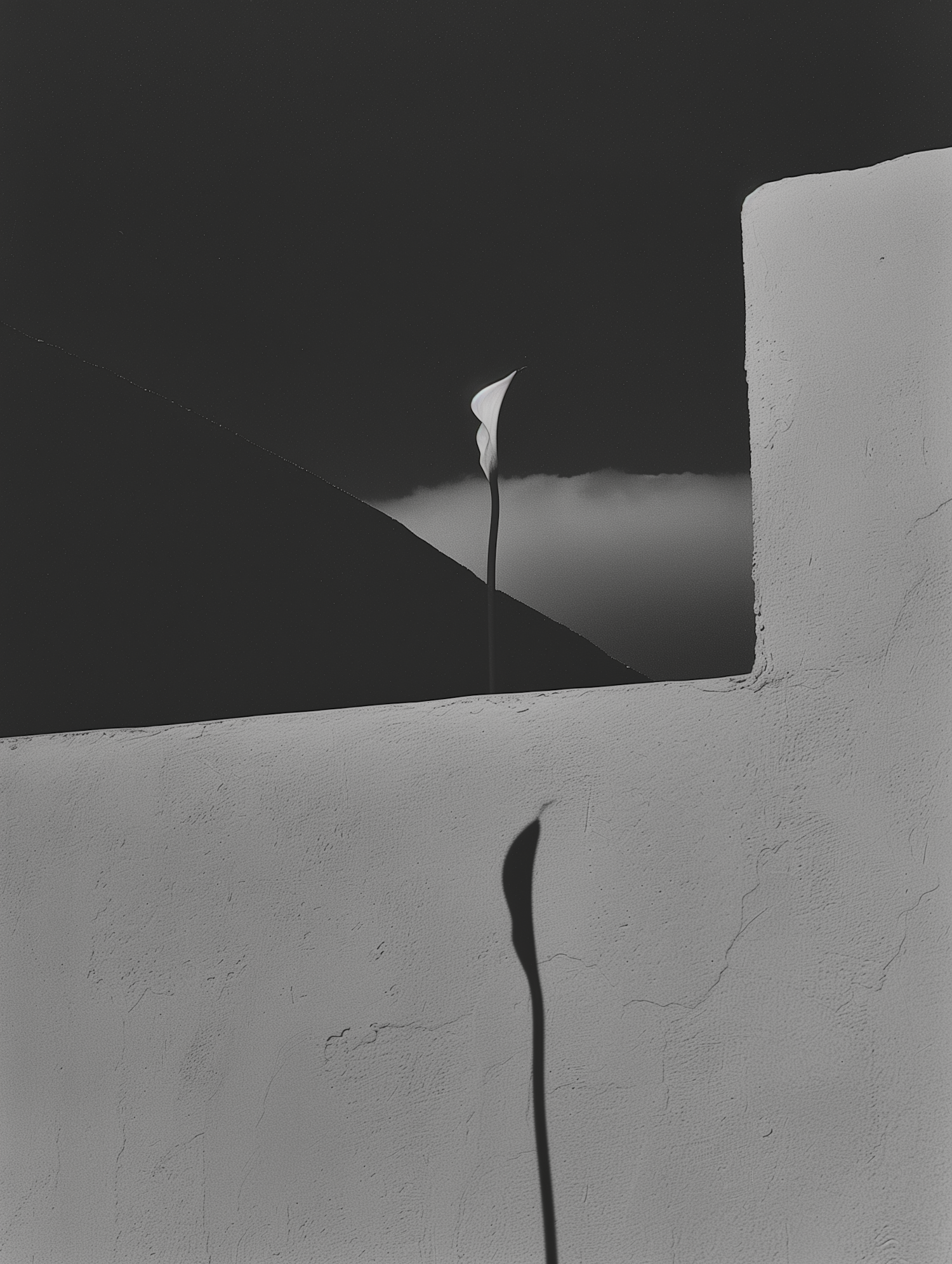 Minimalist black and white photo of a calla lily against a textured wall, with a dark sky and sloping hill in the background.