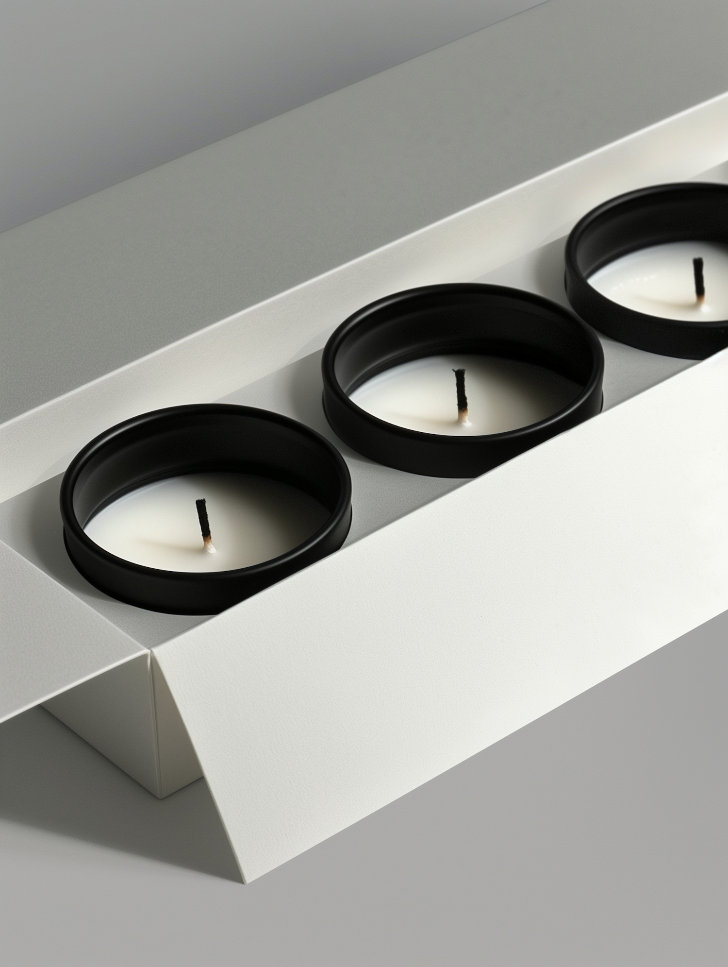 Minimalist candle set in a sleek white box, featuring black containers and white wax, perfect for gifting or home decor.
