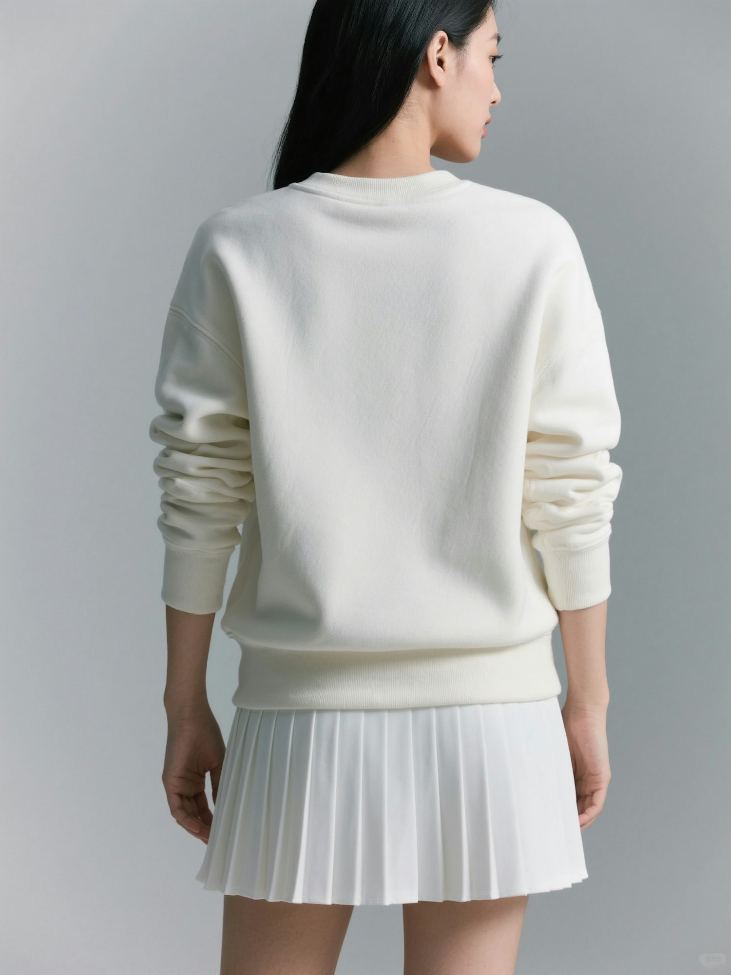 studio photography, clean neutral background, soft even lighting, editorial fashion style, minimal shadows, smooth fabric texture, plain clothing with no logos, no wrinkles, professional product photography, modern and sleek composition, back view of a standing woman wearing a plain crewneck sweatshirt, arms relaxed along the body, head turned slightly away so face is not visible, smooth fabric, paired with a white pleated tennis skirt, focus on the sweatshirt’s back