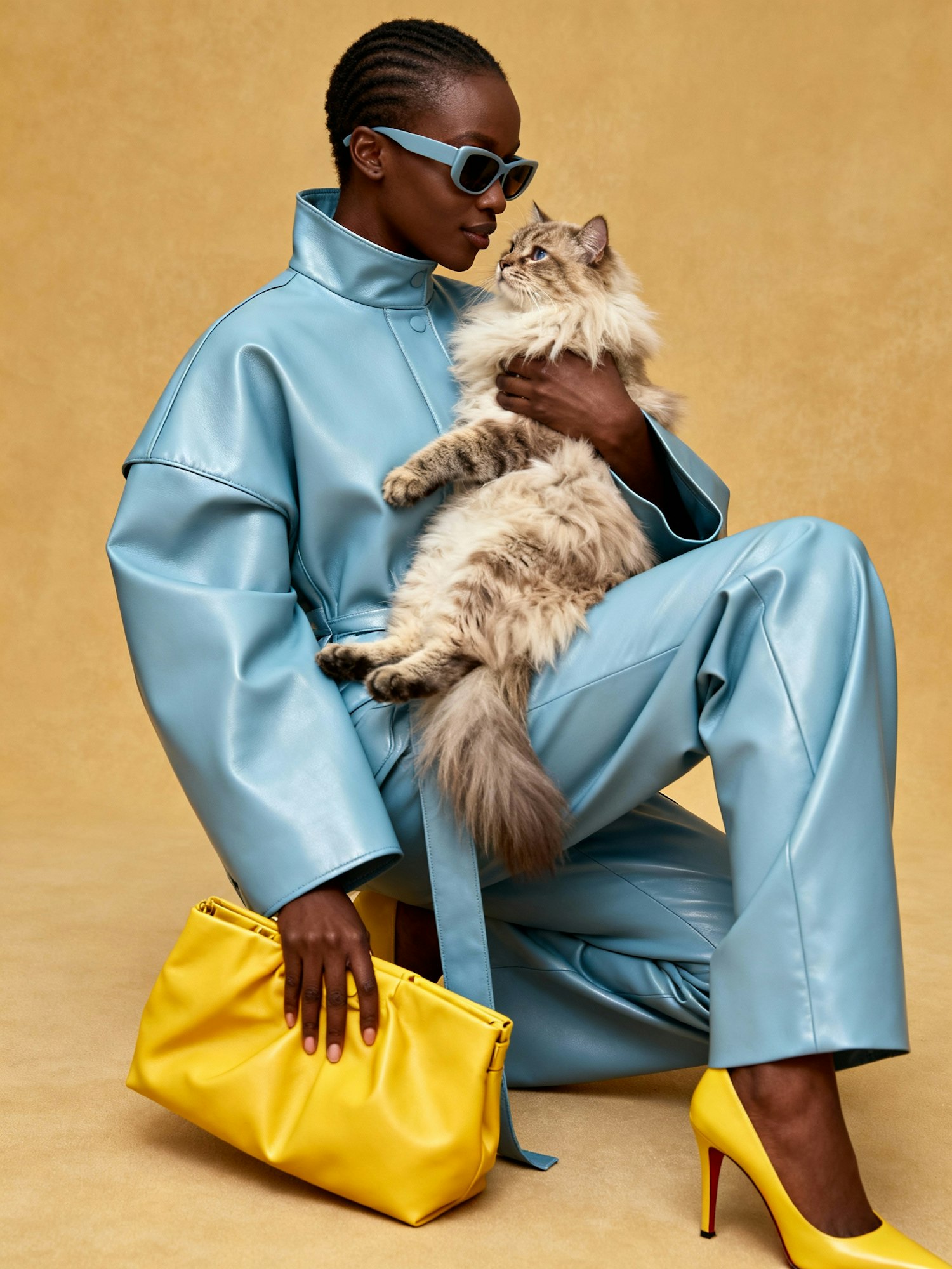 A fashionable person in a blue leather outfit with a yellow clutch and heels holds a fluffy cat, set against a warm beige background.