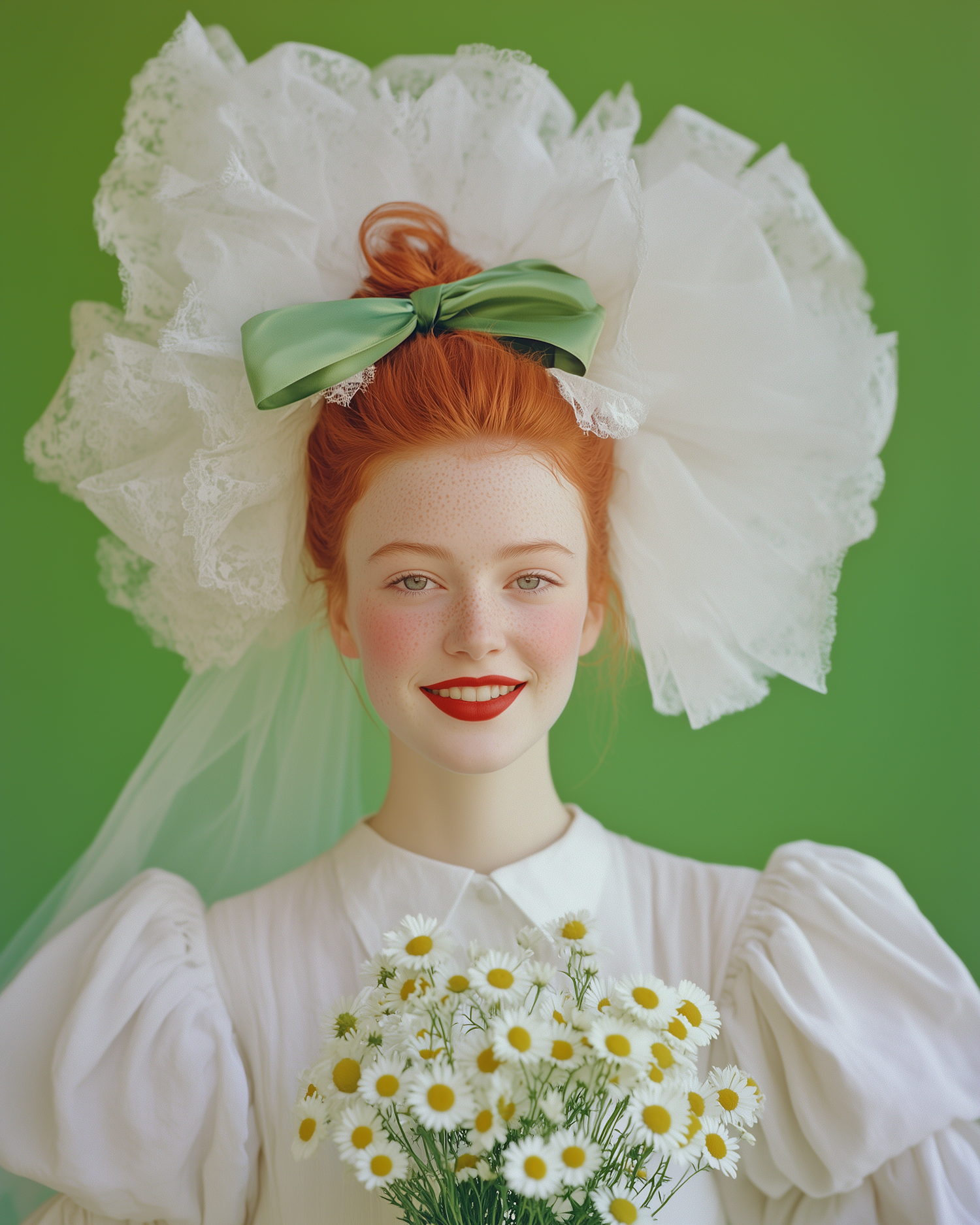 Smiling woman with red hair in a white dress, holding daisies against a vibrant green background.
