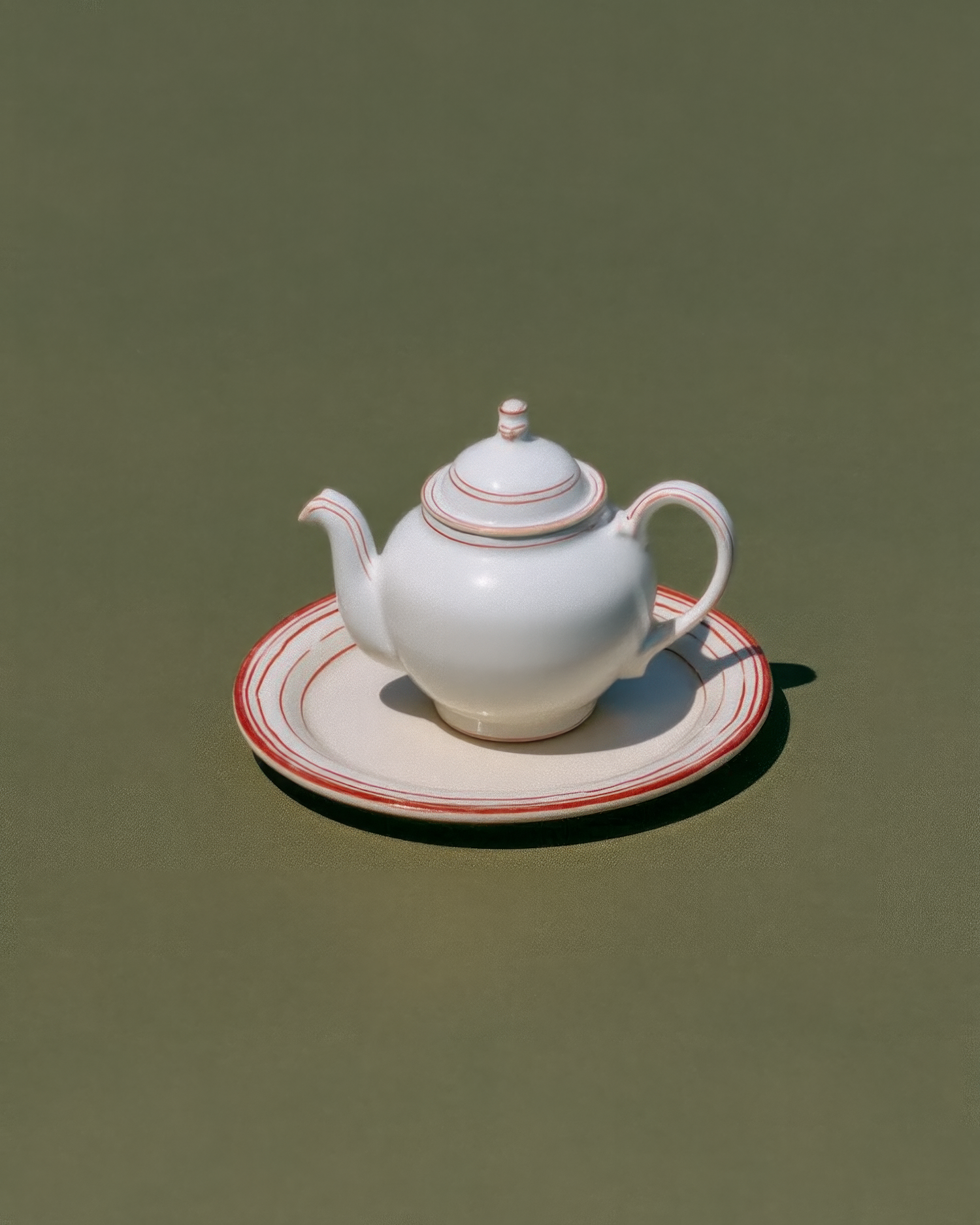 A white ceramic teapot with red accents on a matching saucer, set against a plain olive-green background, minimalist and elegant.