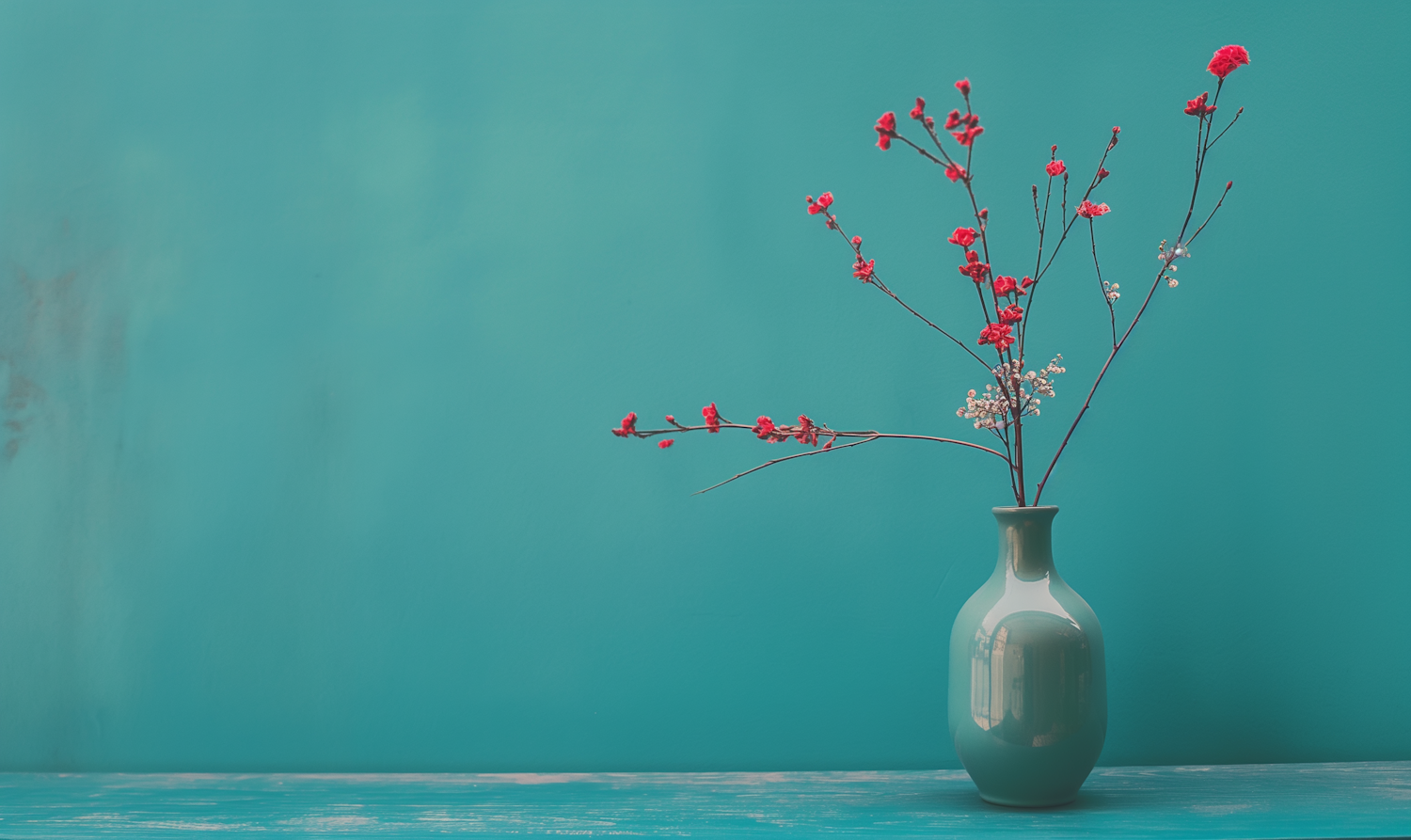 Minimalist teal vase with red blossoms and white flowers on a teal background, creating a serene and modern aesthetic.