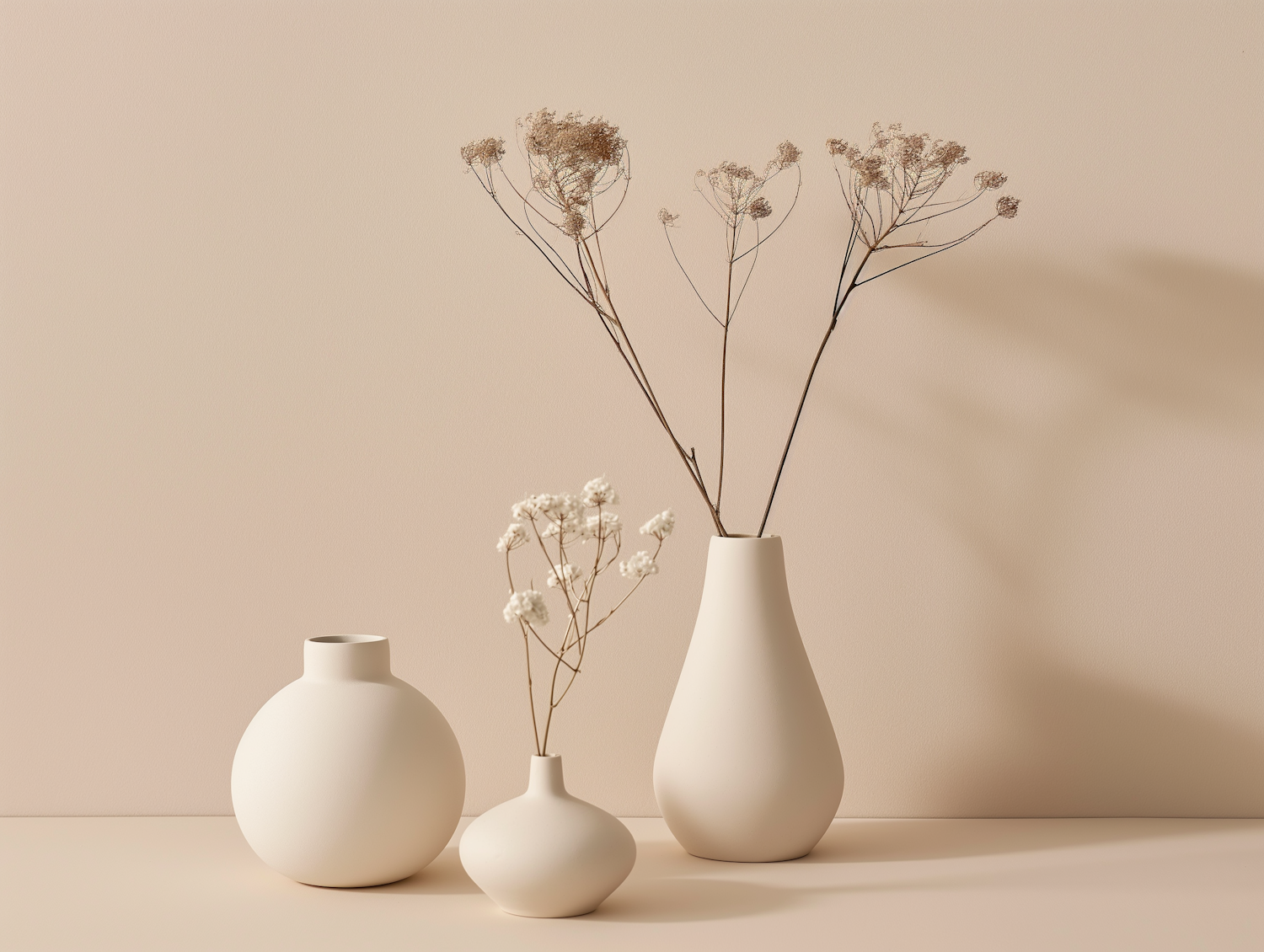 Minimalist beige vases with dried flowers on a neutral background, creating a serene and harmonious composition.