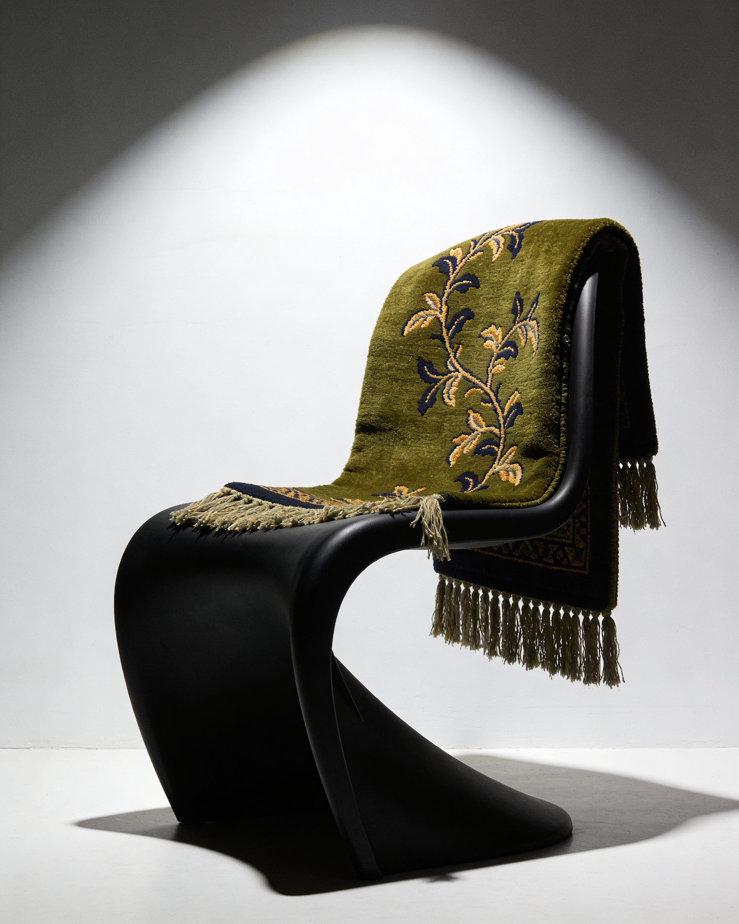 A moss green rug with vine-like embroidery in navy and ochre is casually folded over the backrest of a sculptural mid-century chair in matte black. The fringe is thick and tactile. The scene is set against a white wall with a single spotlight, emphasizing form and texture.