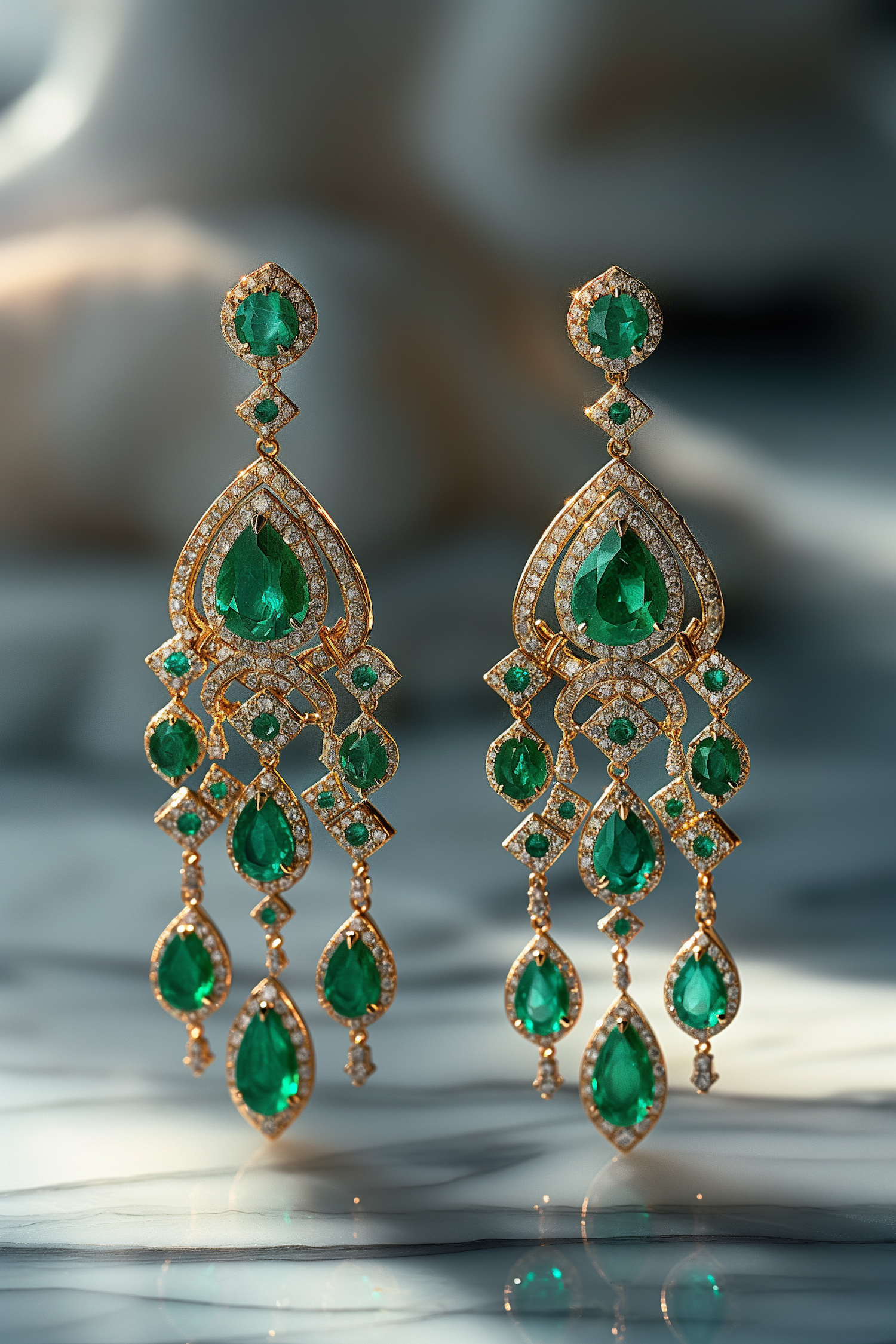 Elegant chandelier earrings with emeralds and diamonds in a teardrop design, set in gold. Luxurious and sophisticated jewelry piece.