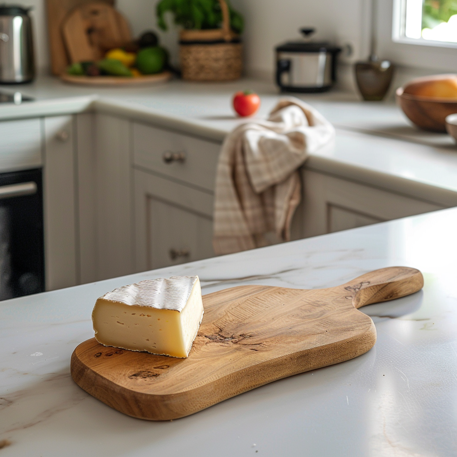 A piece of creamy cheese on a wooden board in a cozy kitchen with fruits and a checkered towel in the background.