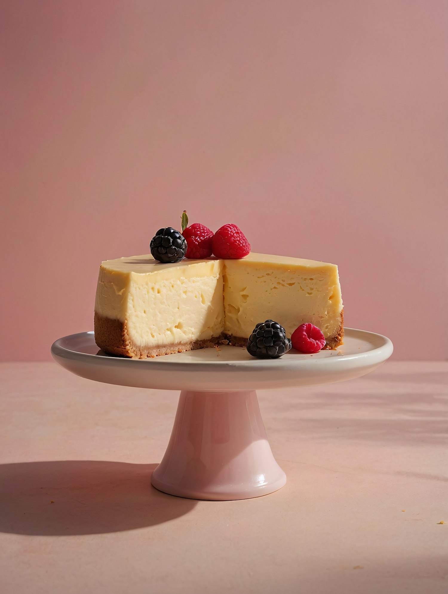 Delicious cheesecake with a golden crust, topped with fresh blackberries and raspberries, on a pink cake stand against a soft pink backdrop.