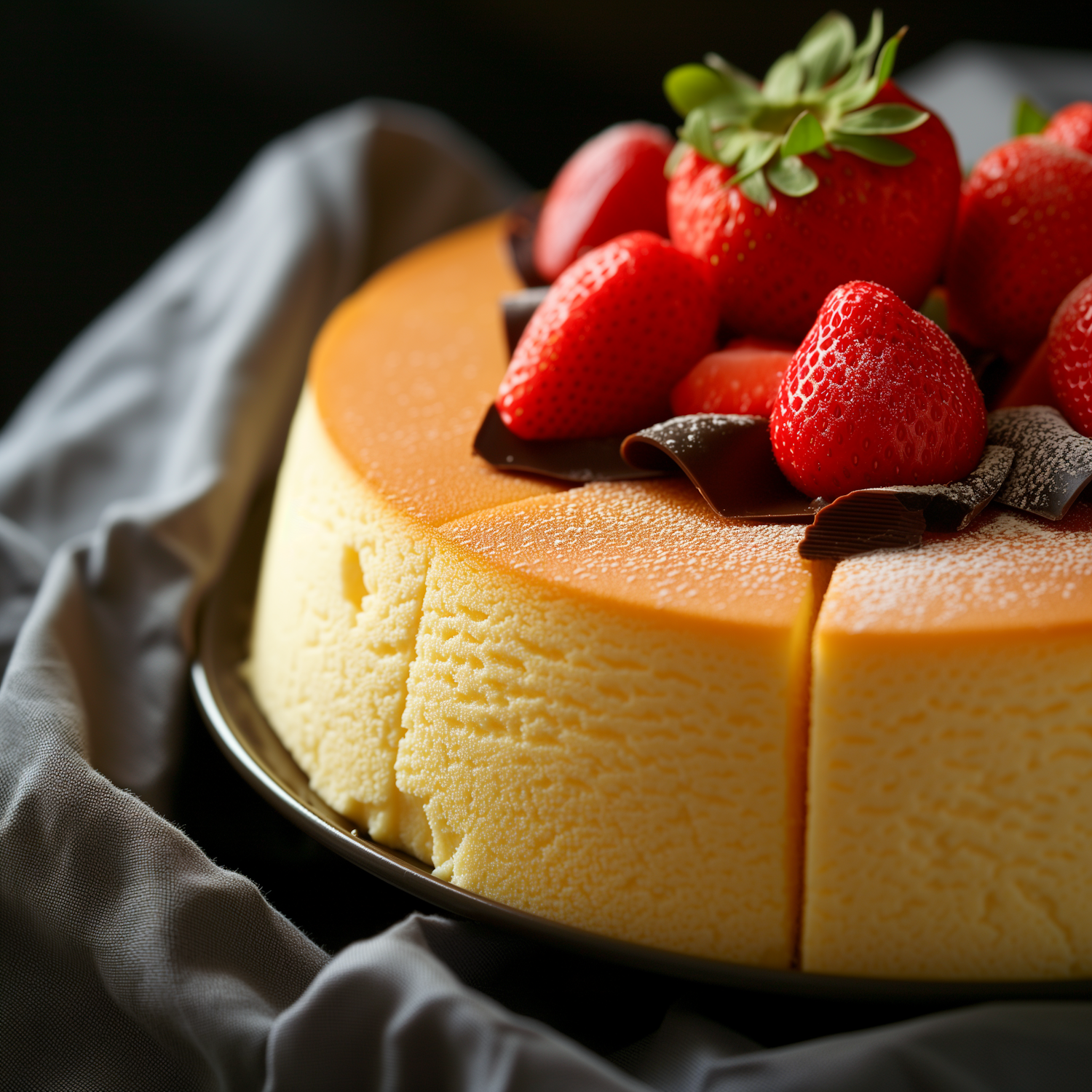 Elegant cheesecake topped with fresh strawberries and chocolate curls, dusted with powdered sugar on a dark plate.