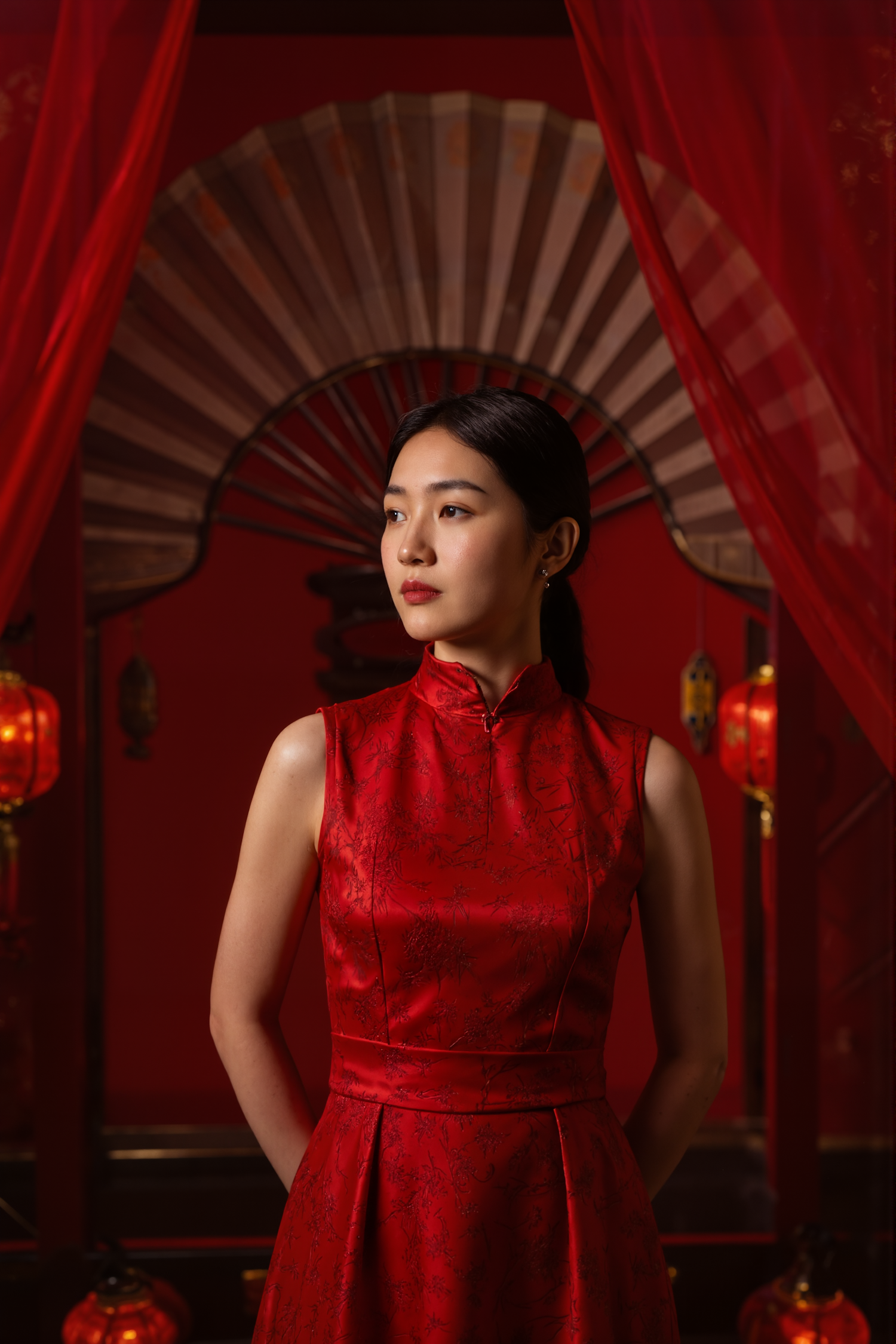 Elegant woman in a red cheongsam surrounded by lanterns and a decorative fan, exuding traditional charm and festive vibes.