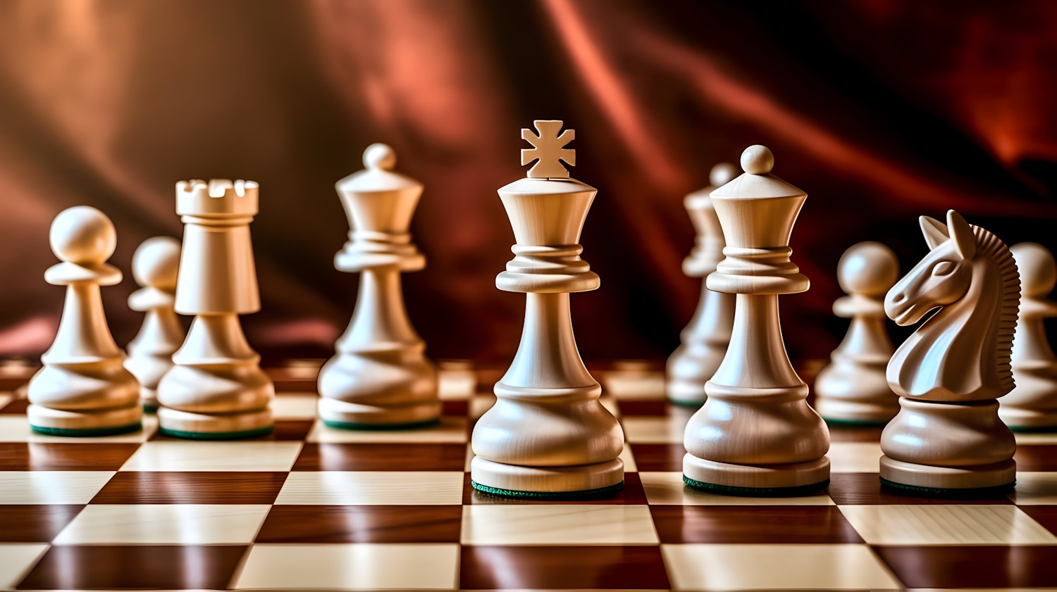 Elegant wooden chess pieces on a glossy board with a warm, dramatic background. Perfect for chess enthusiasts and strategy lovers.
