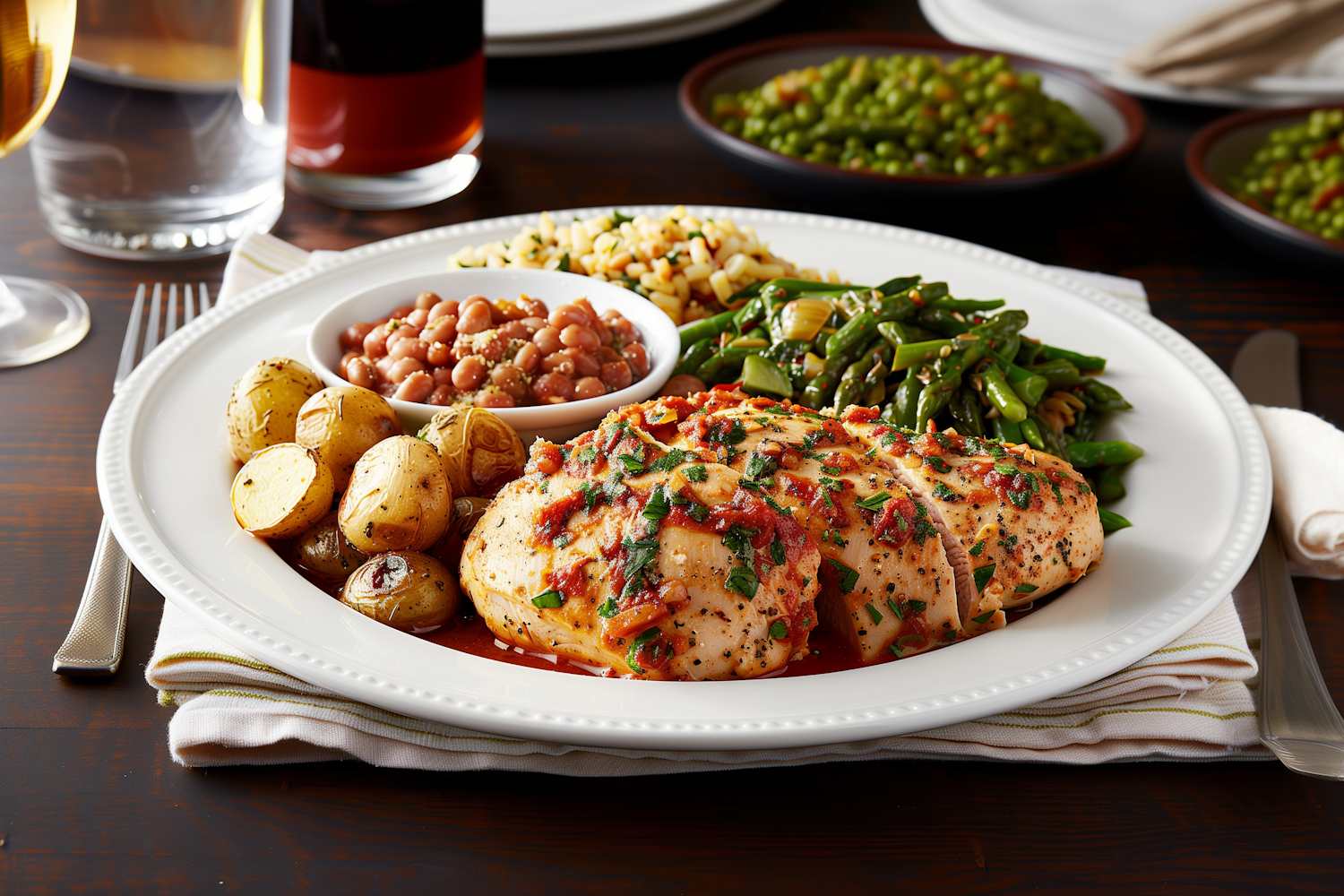 Delicious grilled chicken with roasted potatoes, baked beans, and sautéed green beans on a white plate. Perfectly plated meal.