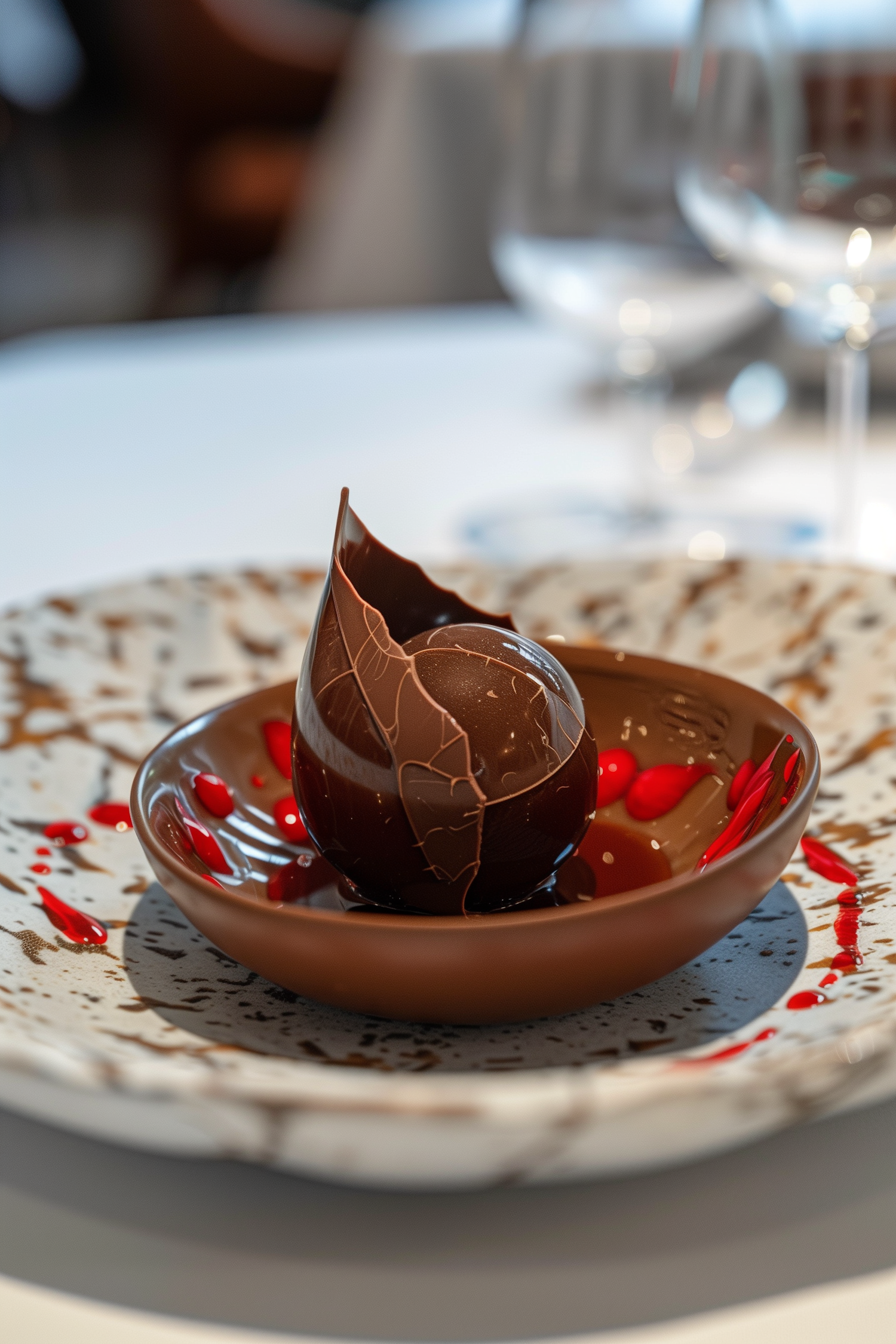 Elegant chocolate dessert with a cracked sphere design, red sauce accents, and artistic plating in a fine dining setting.