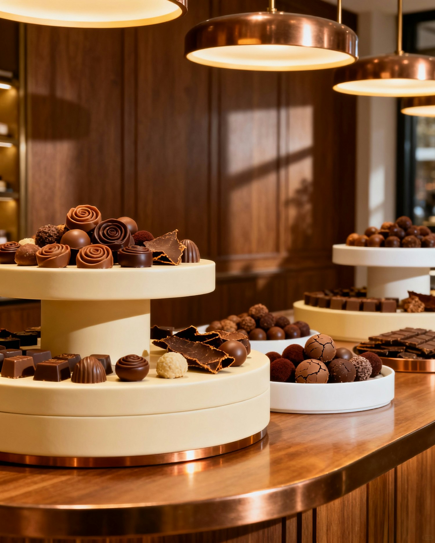A central island display inside a luxury chocolate boutique. Use round tiered trays in matte cream or white, filled with assorted artisanal chocolates. The table should be made of warm wood with bronze edges. Overhead lighting: circular pendant lamps with soft warm light. Surrounding ambiance: elegant, quiet, with wooden panel walls and soft shadows. No logos.