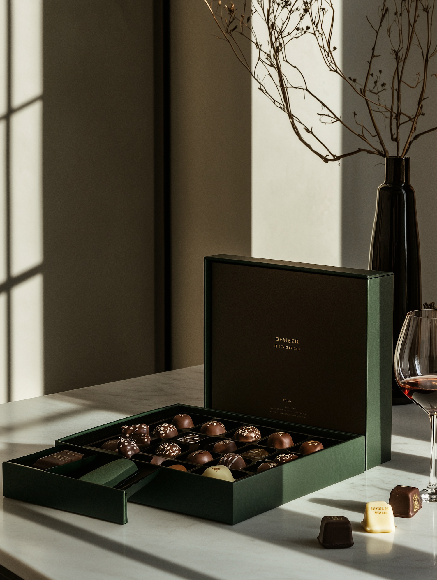 Elegant green box of assorted chocolates on marble, paired with red wine and minimalist decor in soft, dramatic lighting.