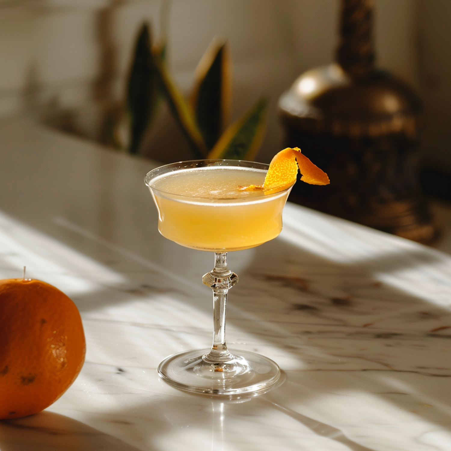 Elegant cocktail with orange peel garnish on a marble table, bathed in warm sunlight. Perfect for a sophisticated setting.