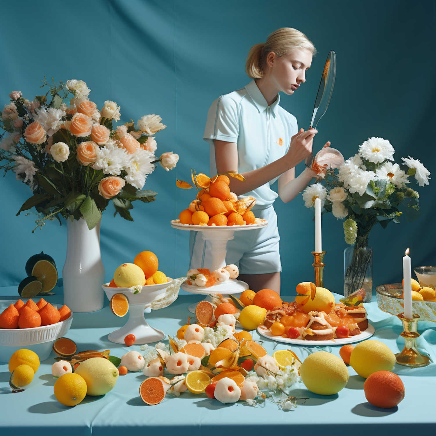 Elegant still life with citrus fruits, flowers, and a woman peeling an orange in a serene blue setting.