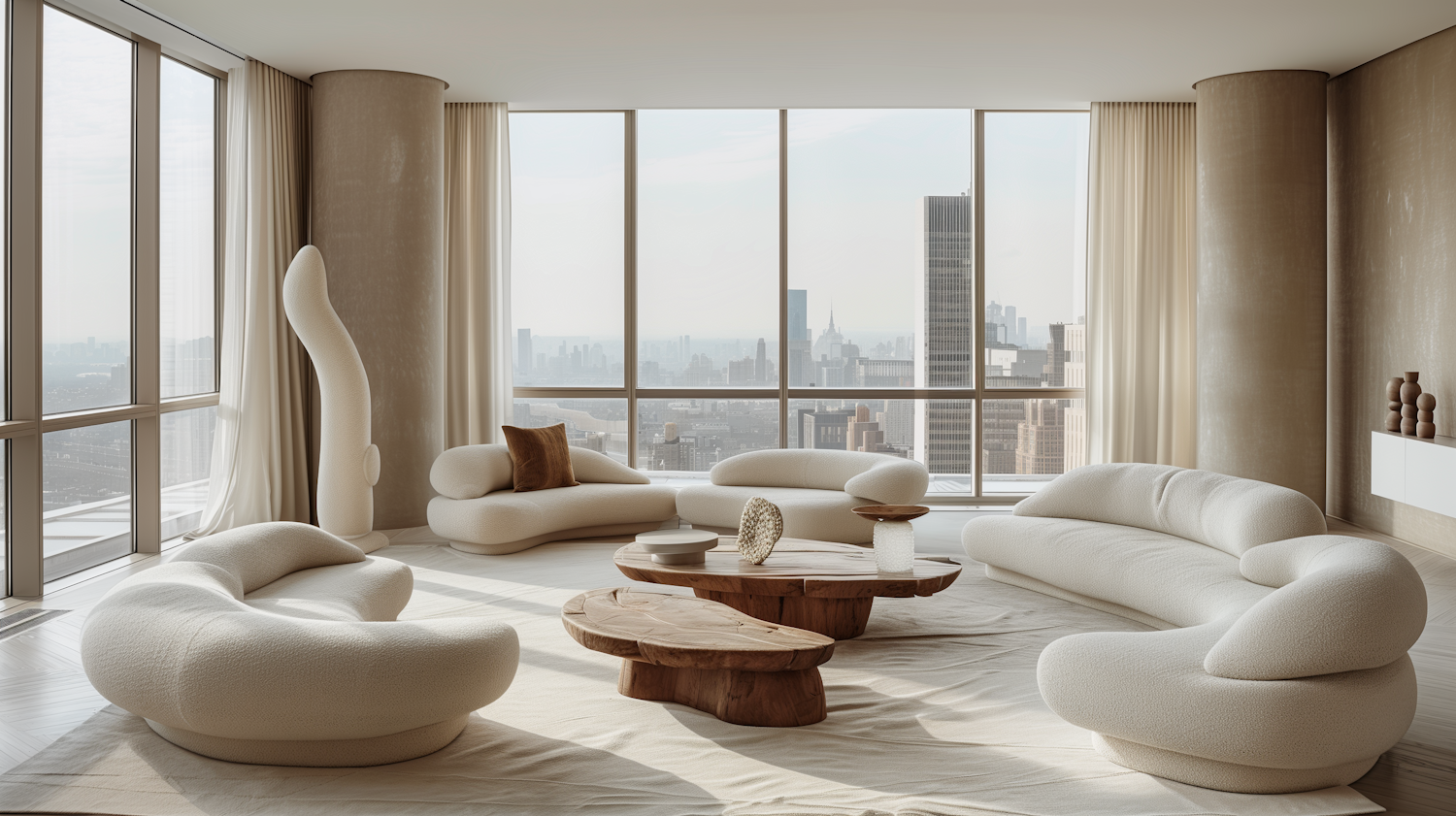Luxurious living room with panoramic city views, plush white sofas, and organic wooden tables in a minimalist design.
