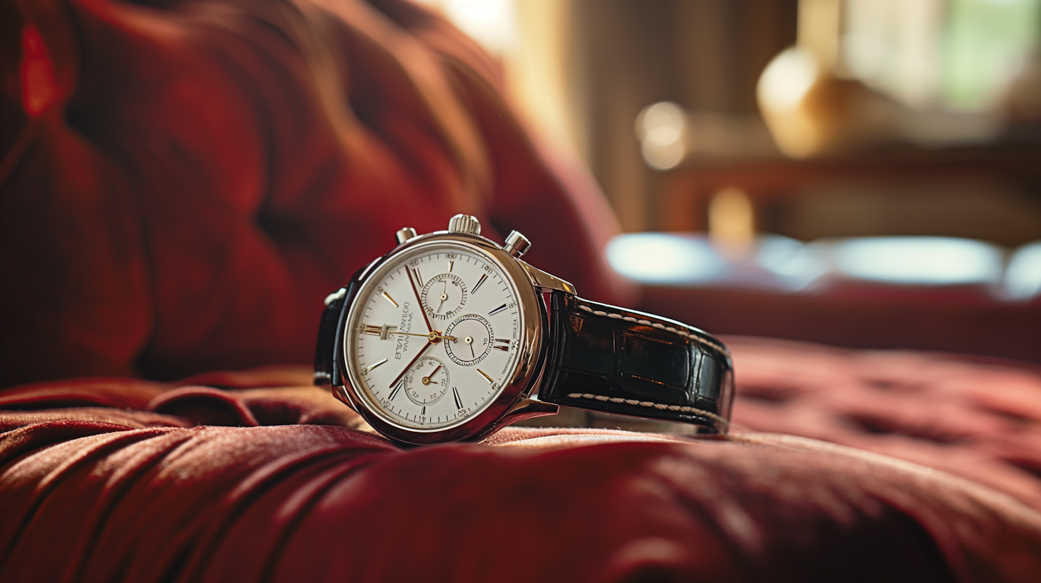 Elegant wristwatch with silver case, white dial, and black leather strap on red velvet. Warm lighting highlights its luxury design.