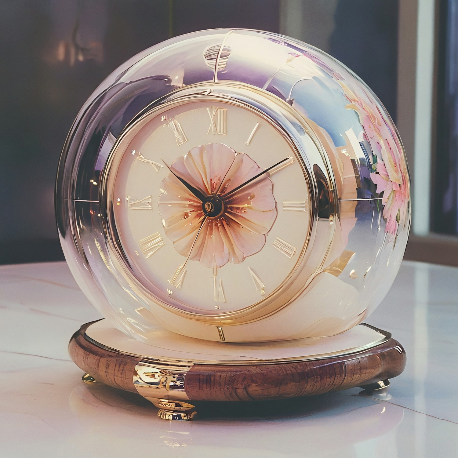 Elegant table clock with floral design, golden Roman numerals, and a polished wood base under a transparent glass dome.