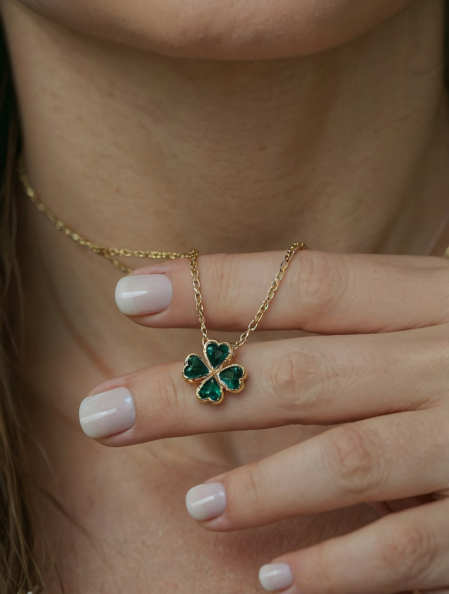 Elegant gold necklace with a green gemstone four-leaf clover pendant, held by a hand with glossy white nails. Perfect for a chic look.