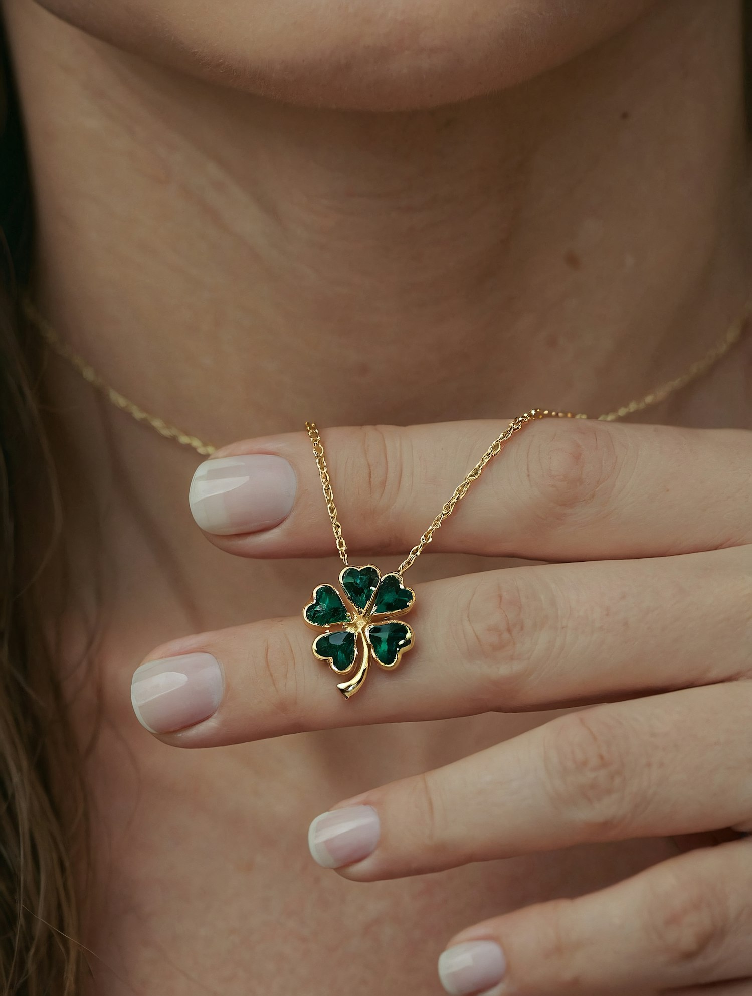 Elegant gold necklace with a green gemstone four-leaf clover pendant, held by a hand with soft pink manicured nails.