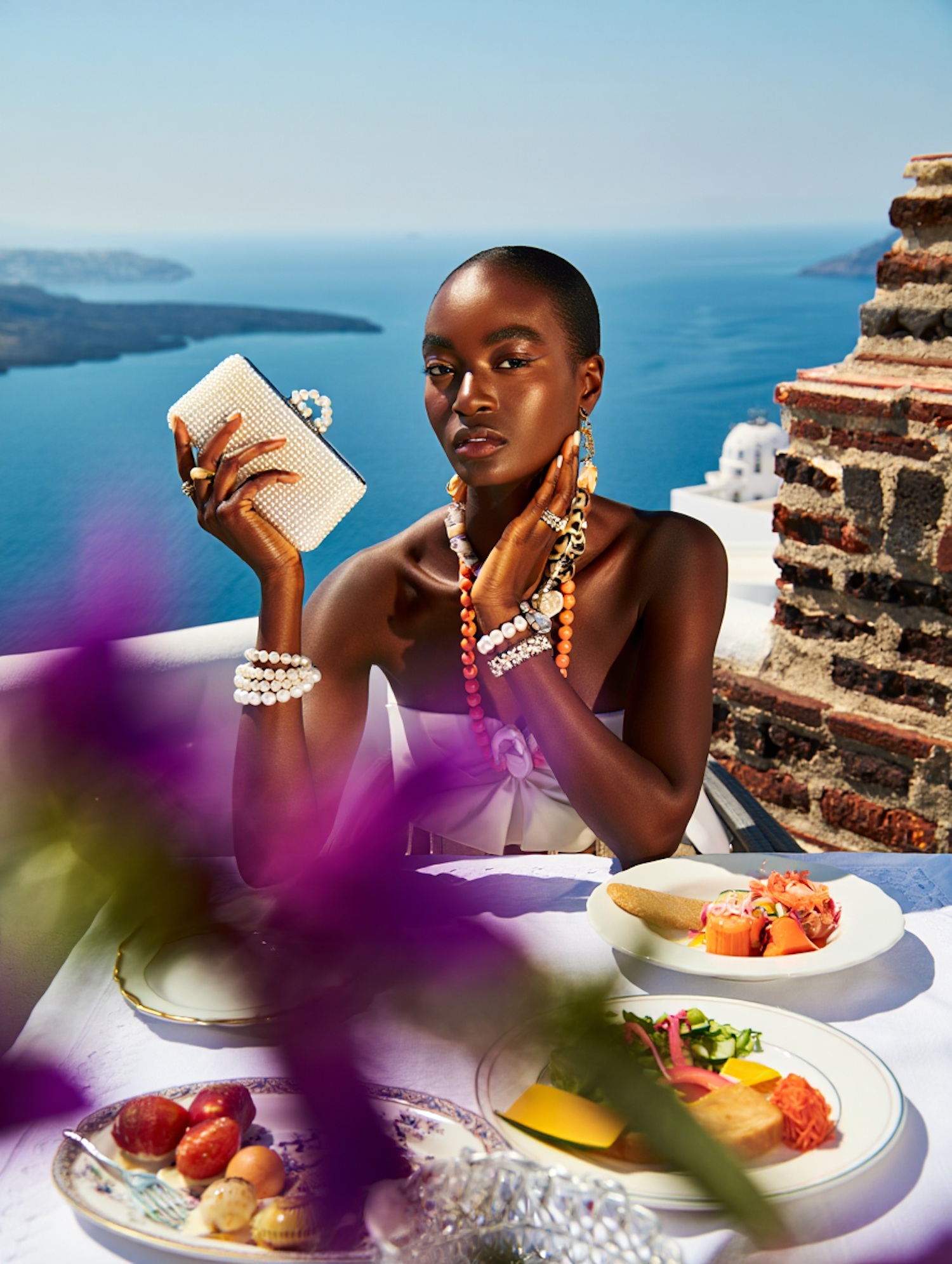 Elegant outdoor dining scene with a fashionable individual, exquisite food dishes, and a vivid coastal setting.