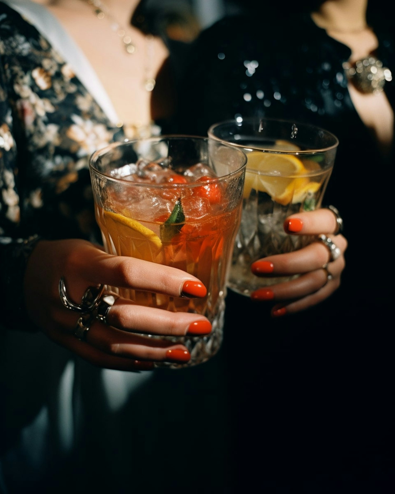 Two hands with red nails hold crystal glasses of cocktails, adorned with rings, in a dimly lit, elegant setting.