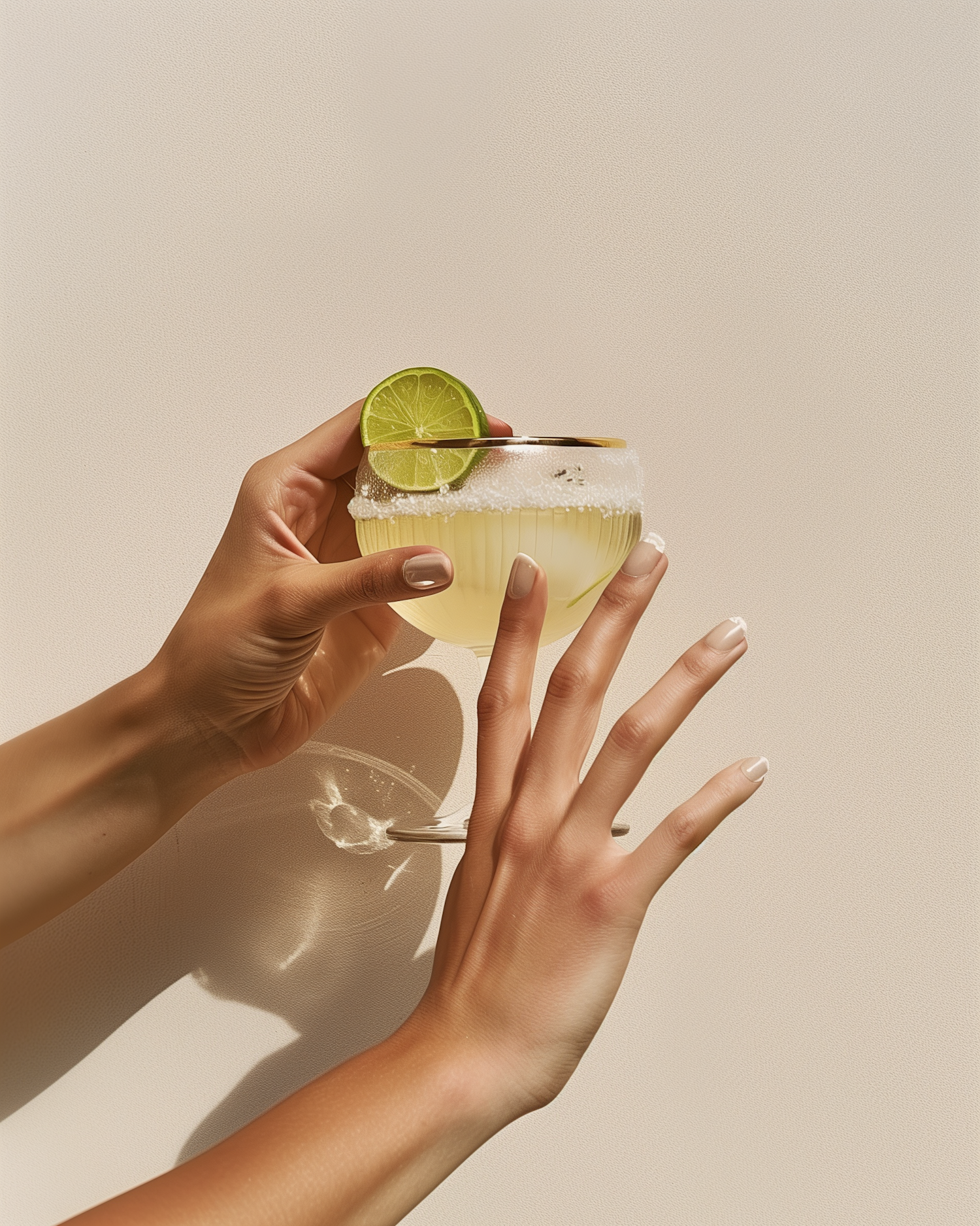 Elegant hands holding a margarita with lime and salt rim against a beige background, casting a soft shadow.