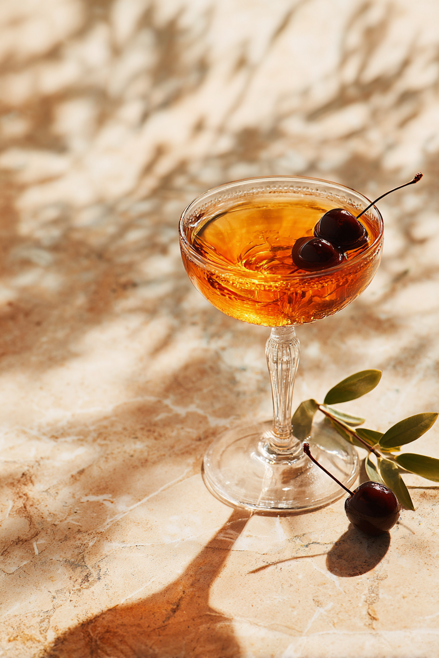Elegant coupe glass with amber cocktail, garnished with cherries, on a marble surface with warm natural light and soft shadows.