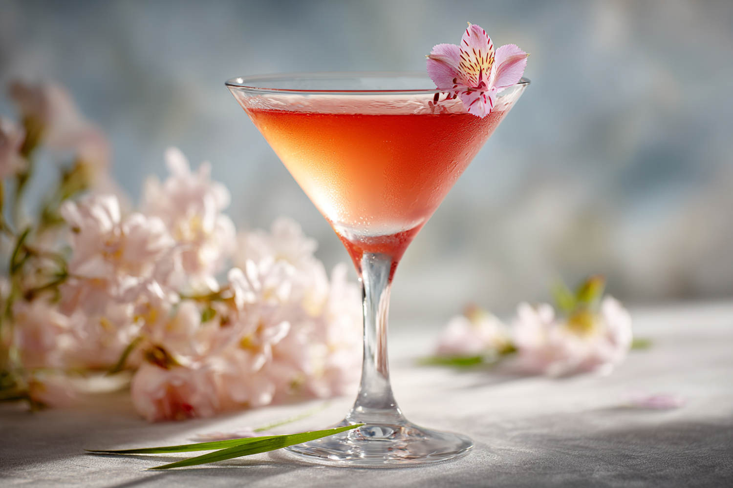 A refreshing cocktail in a martini glass, garnished with a pink flower, set against a soft floral background for a springtime vibe.