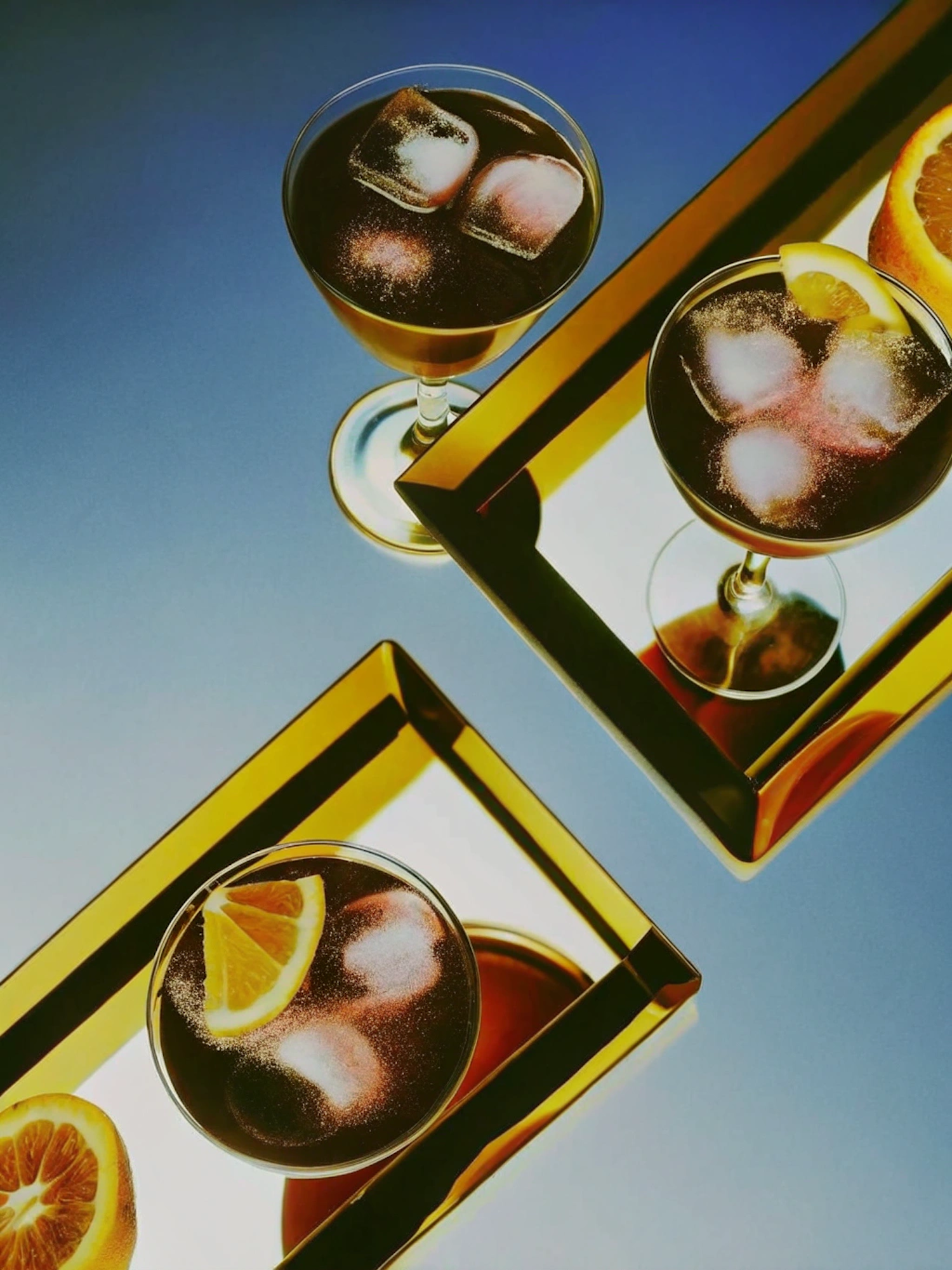Stylish cocktail glasses with ice and citrus garnishes on golden trays, set against a cool blue gradient background.