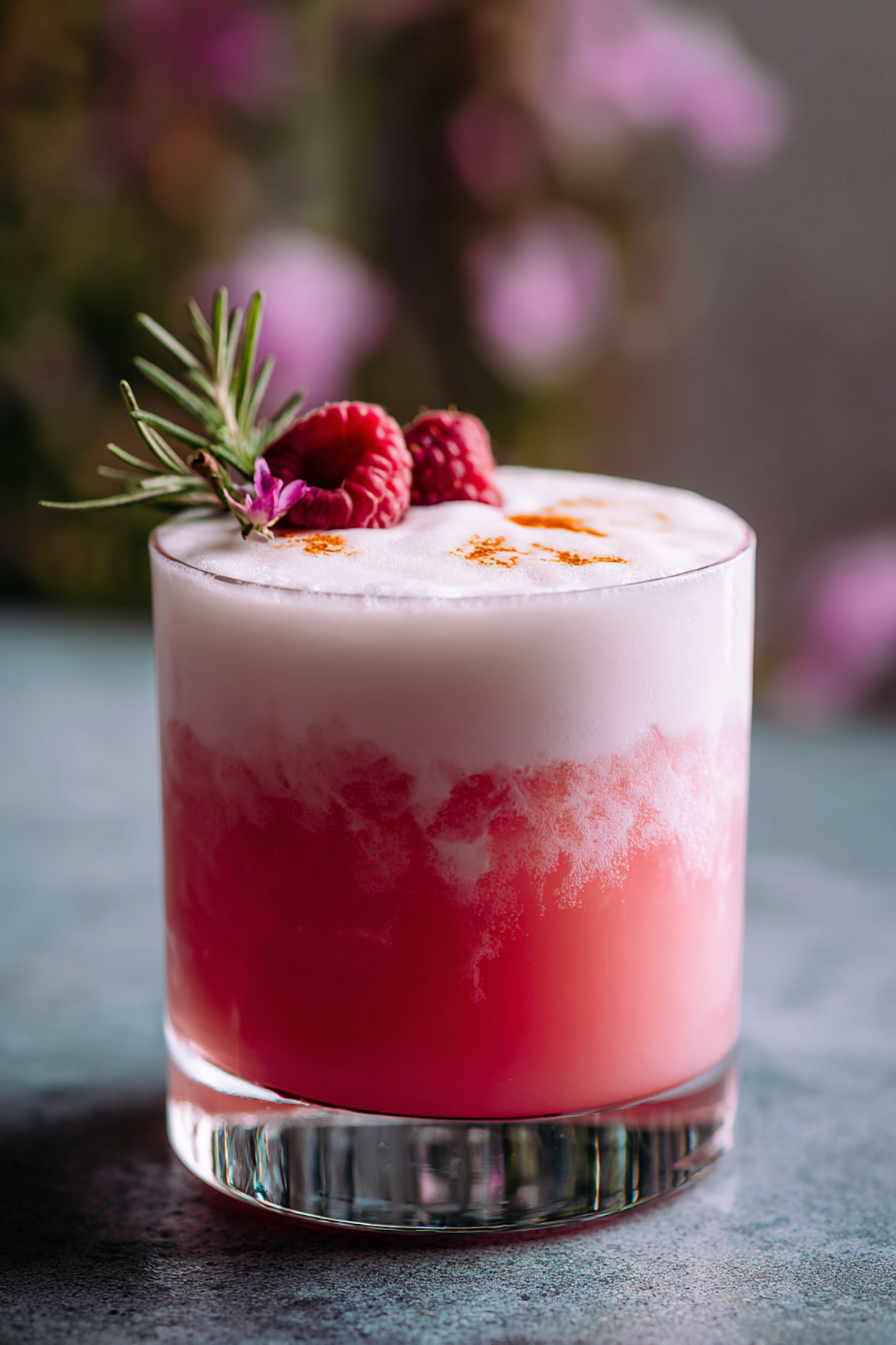 A beautifully crafted pink cocktail with foam, garnished with raspberries, rosemary, and a flower, perfect for a refreshing treat.