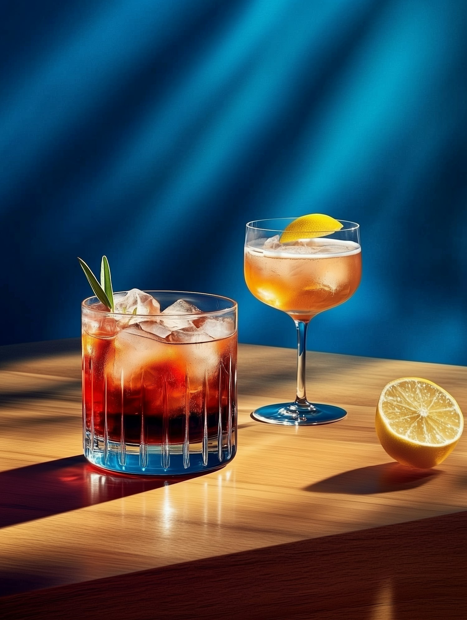 Two stylish cocktails on a wooden table, one red with rosemary, the other golden with lemon, set against a deep blue background.