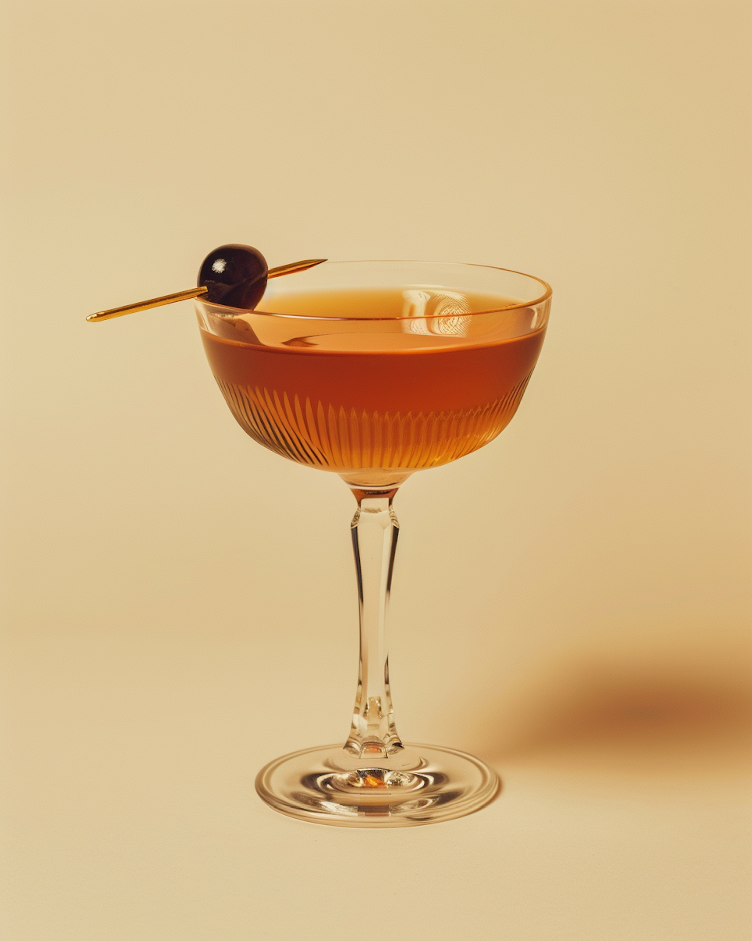 Elegant cocktail glass with amber drink and cherry garnish on a golden pick, set against a soft beige background.
