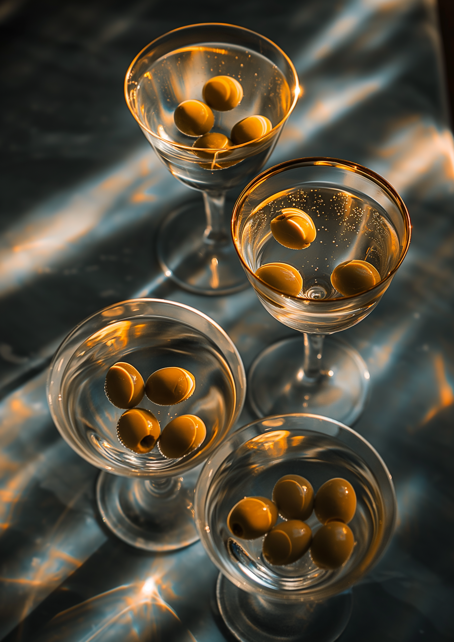 Elegant martini glasses with green olives, bathed in warm light, creating a sophisticated and inviting atmosphere.