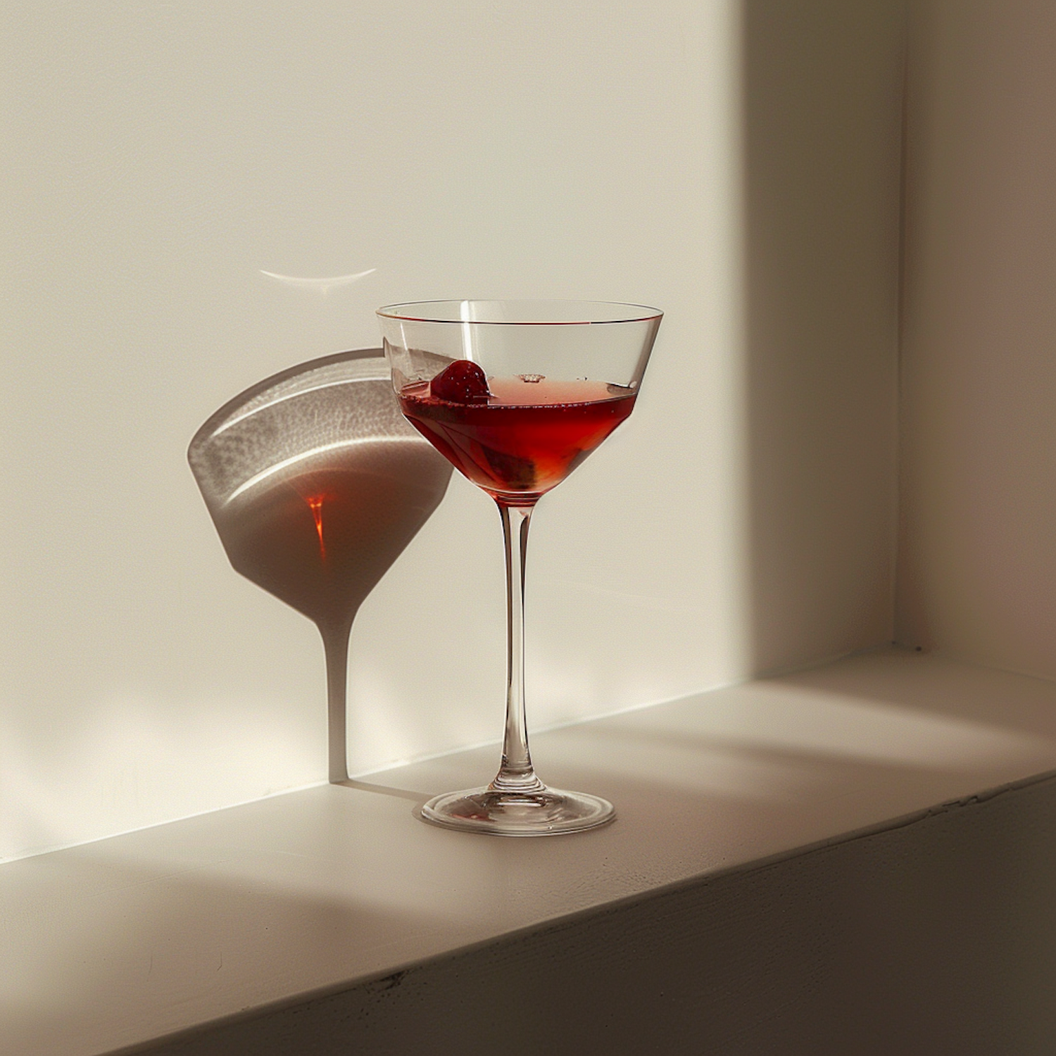 Elegant cocktail glass with red drink and raspberry garnish, casting a shadow on a white surface in warm natural light.