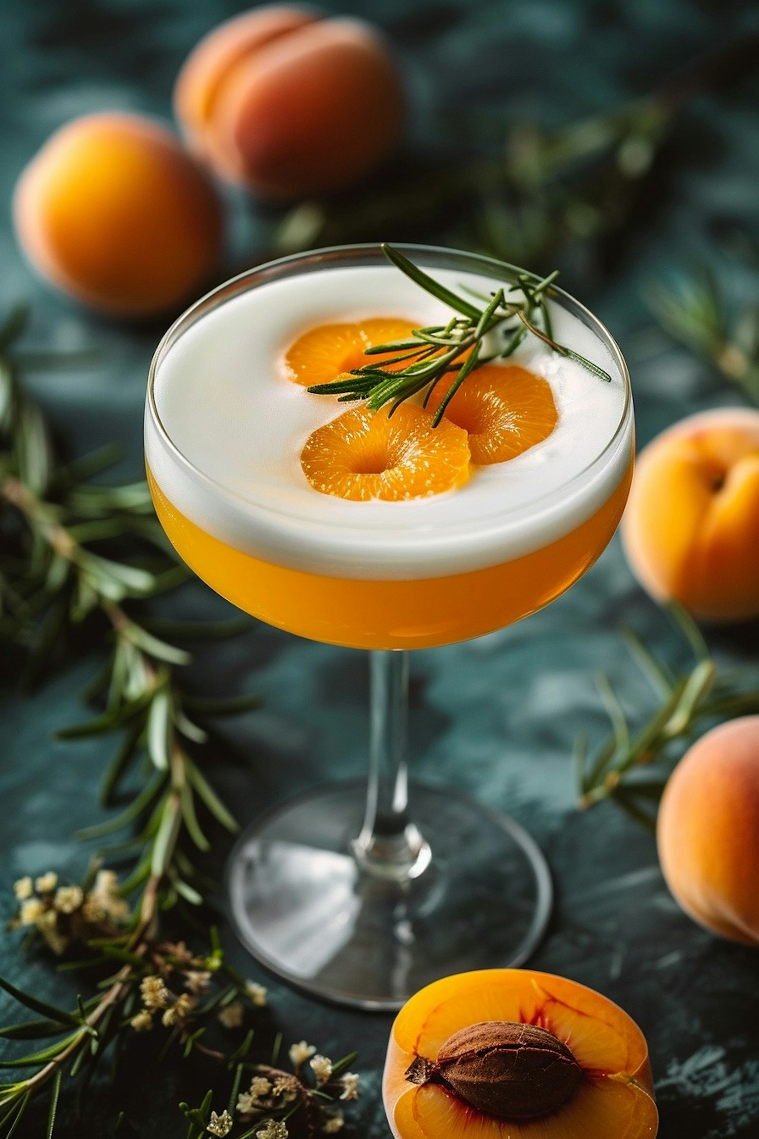 Elegant cocktail with orange slices and rosemary in a coupe glass, surrounded by fresh peaches on a dark green surface.