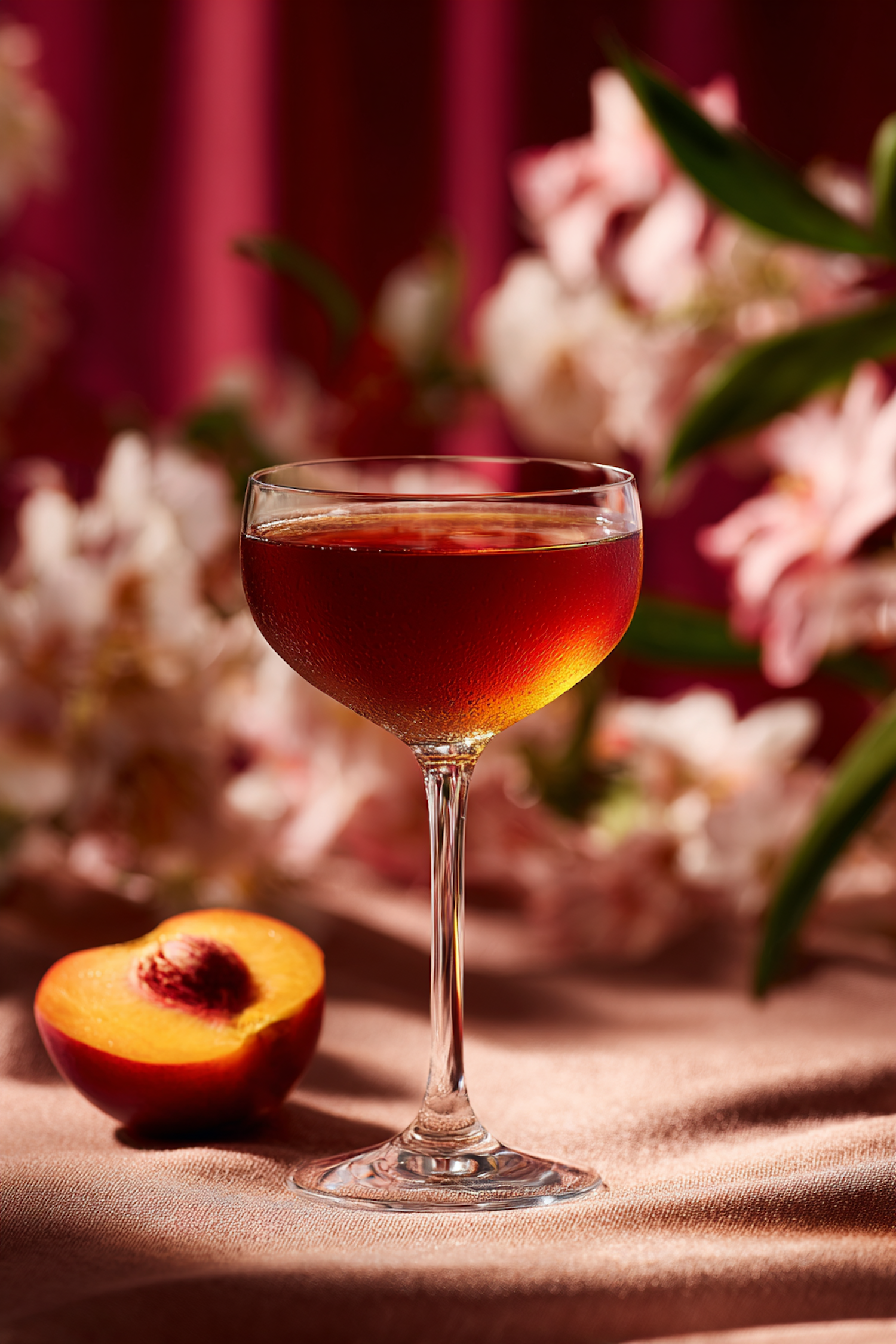 Elegant coupe glass with a dark amber cocktail, paired with a halved peach, set against a floral and romantic background.
