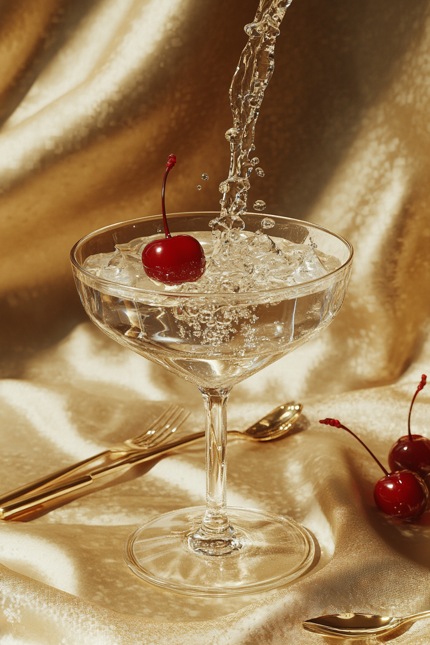 Elegant cocktail glass with ice and cherry, set against a golden fabric backdrop with golden utensils, exuding luxury and sophistication.
