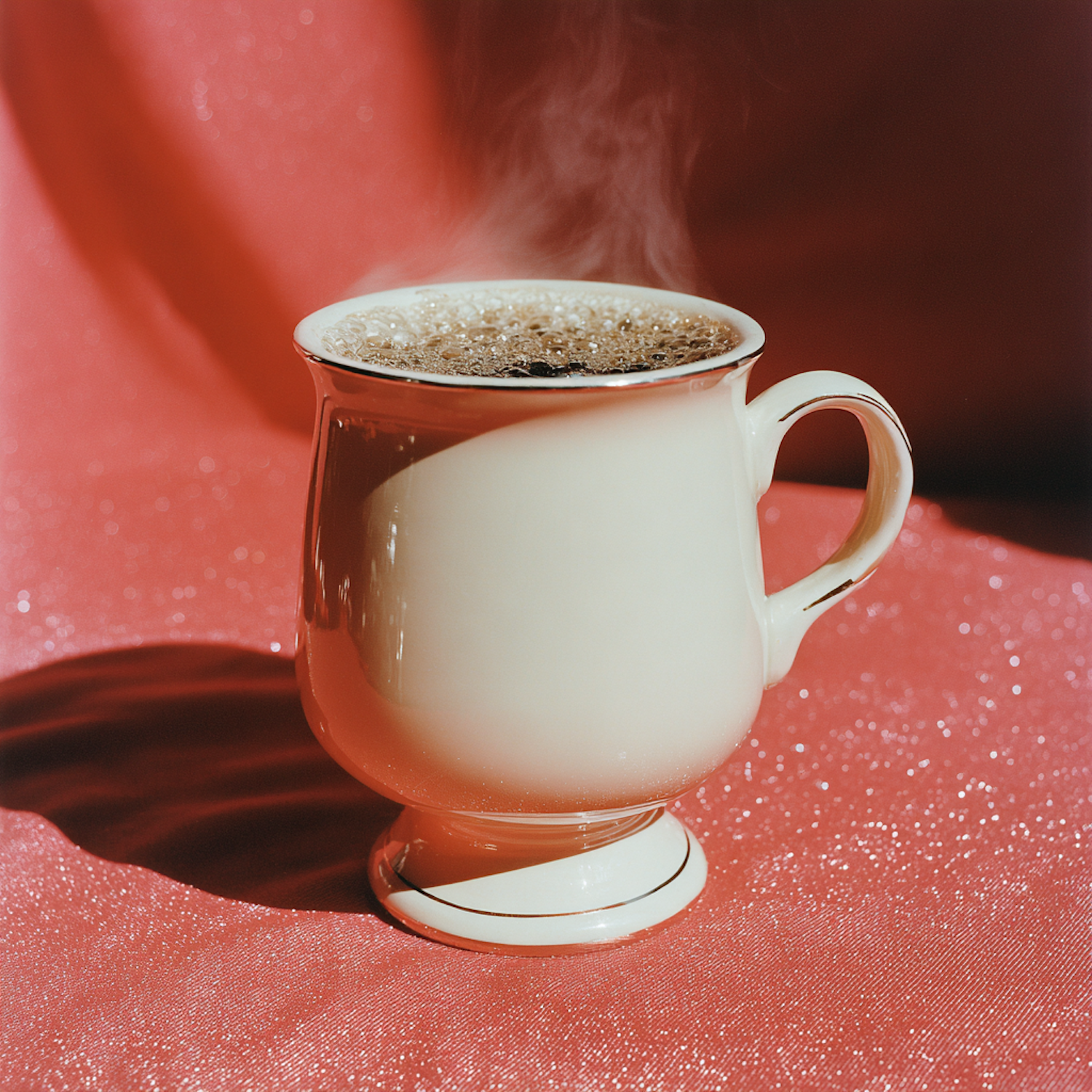 A steaming cup of coffee in a cream ceramic mug with a gold rim, set against a vibrant red glittery background.