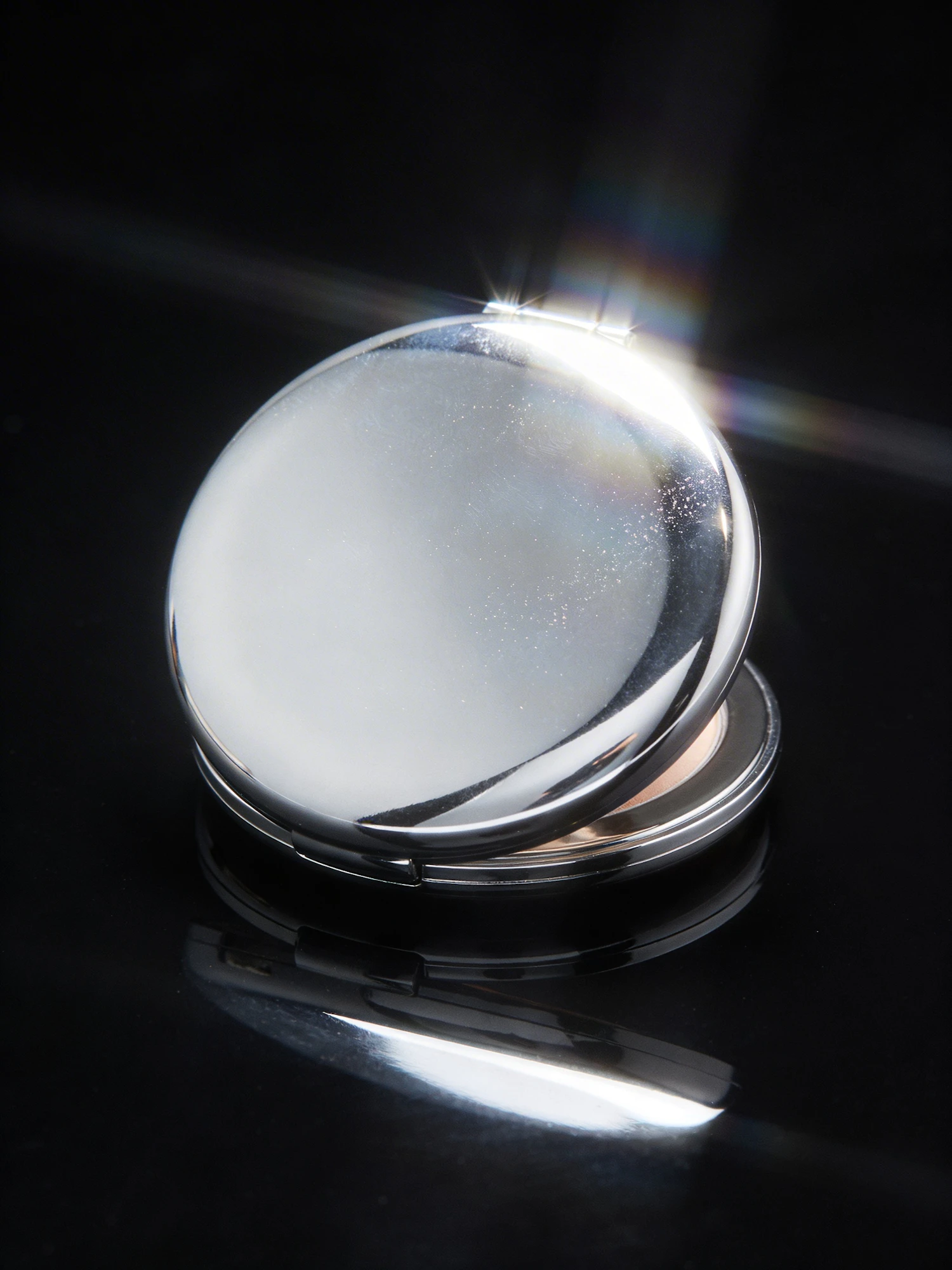 A shiny metallic compact mirror on a black surface, reflecting light and creating a subtle rainbow effect, with a sleek and elegant design.