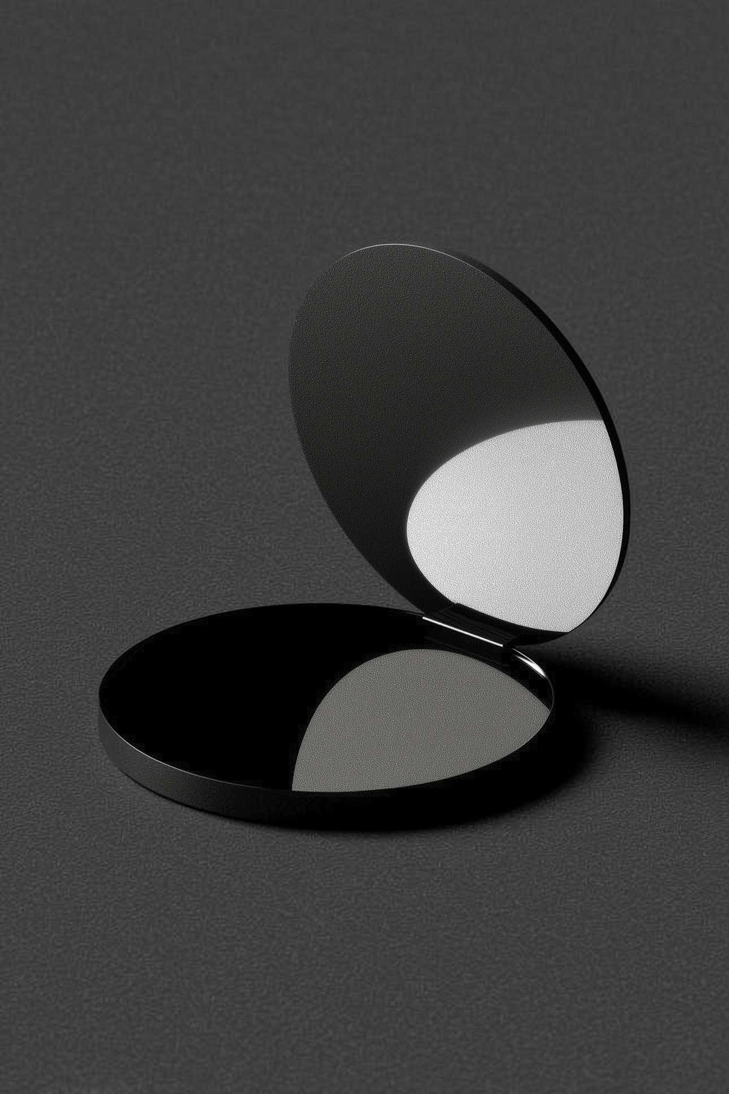 A stylish open compact mirror with a sleek design, reflecting light on a textured dark surface, showcasing elegance and simplicity.