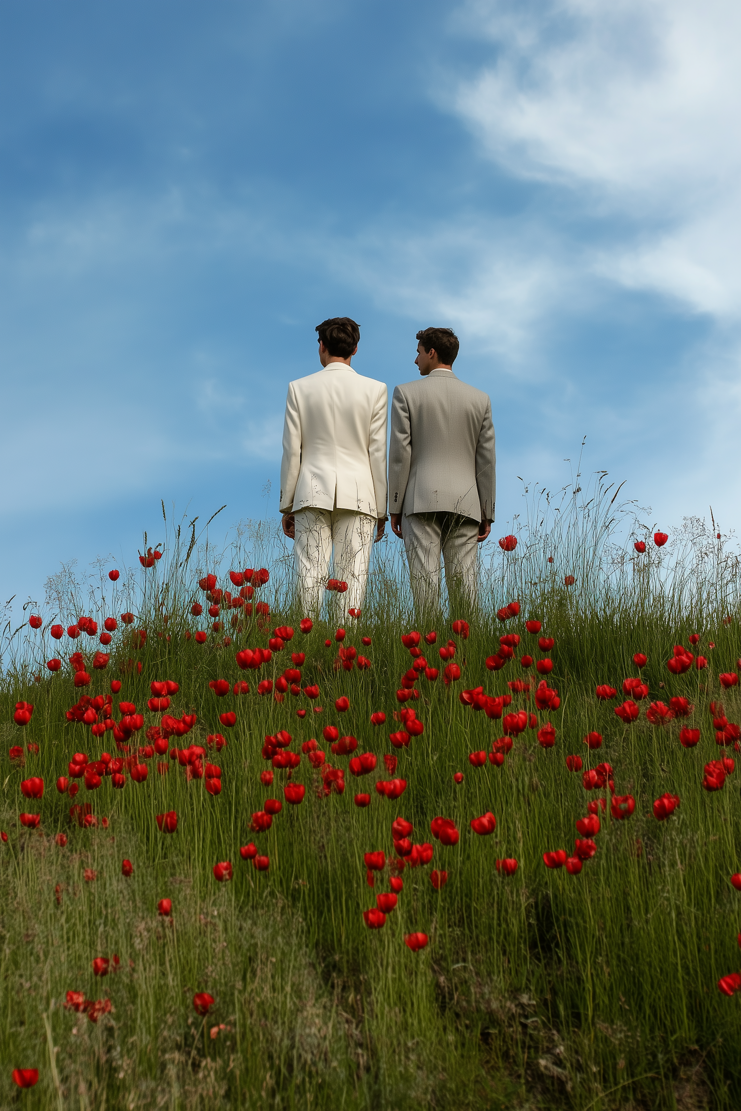 Two men in white and gray suits stand on a hill with red poppies under a blue sky, creating a serene and elegant scene.