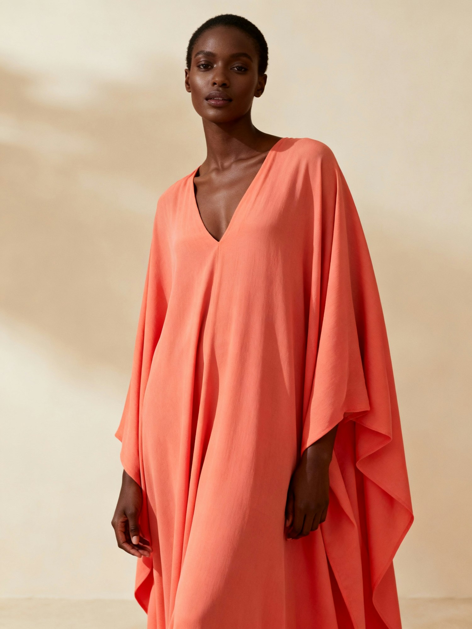 A person in a flowing coral dress stands against a neutral background, showcasing elegance and simplicity in a soft, natural light.