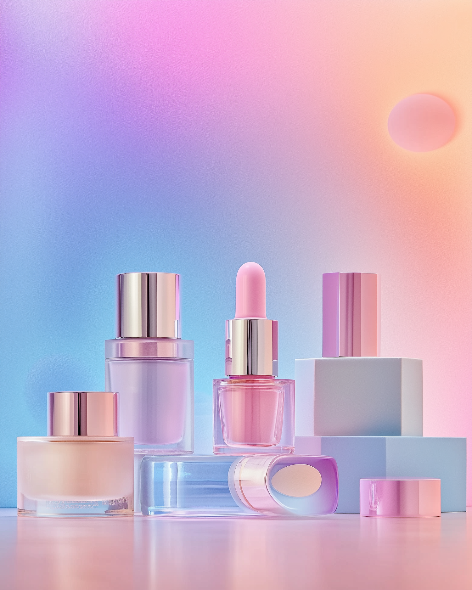 Elegant cosmetic bottles on a pastel gradient background, featuring glossy finishes and a luxurious, modern aesthetic.