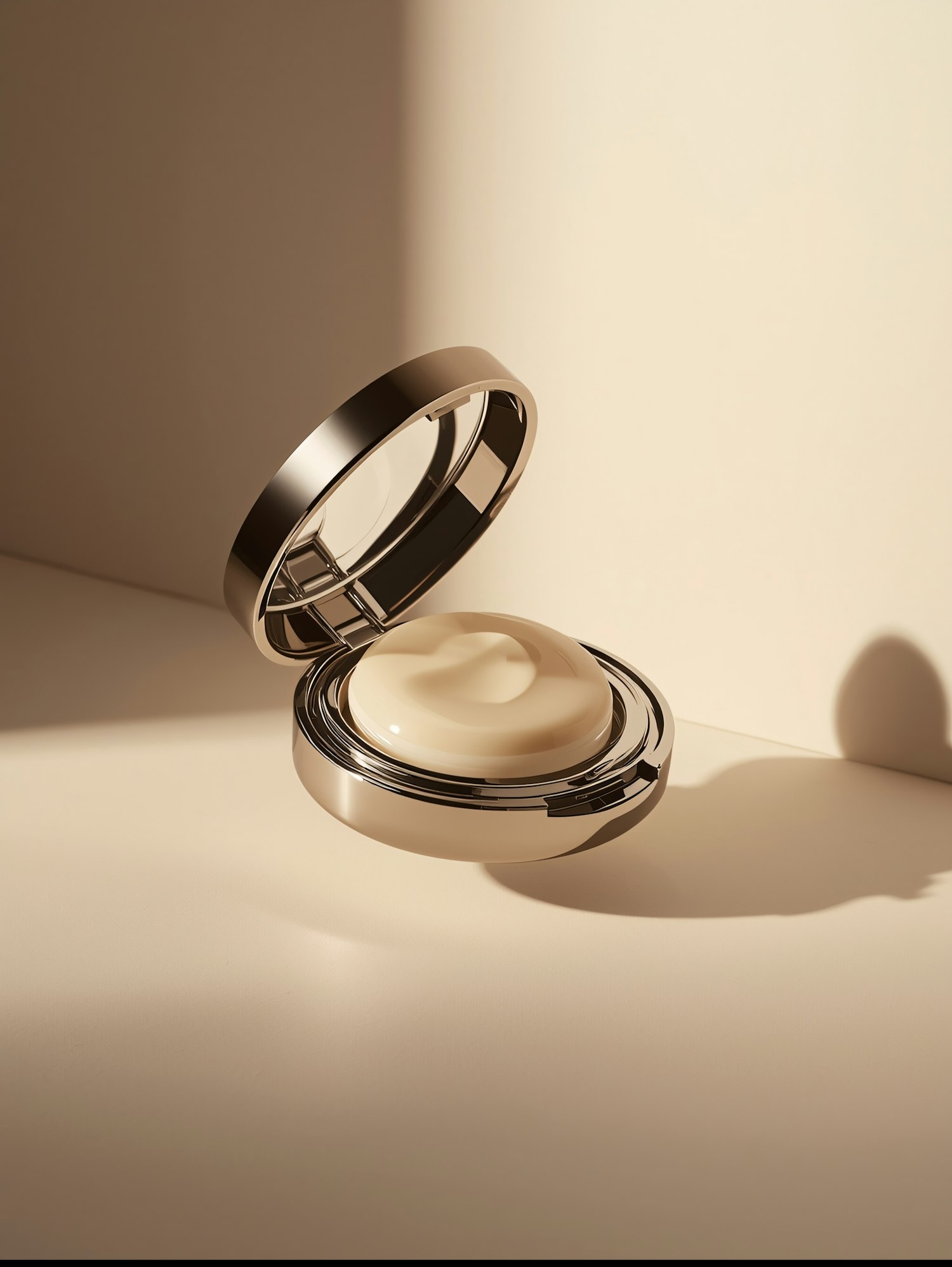 Elegant metallic compact case open to reveal a smooth cream product, set against a warm beige background with soft shadows.