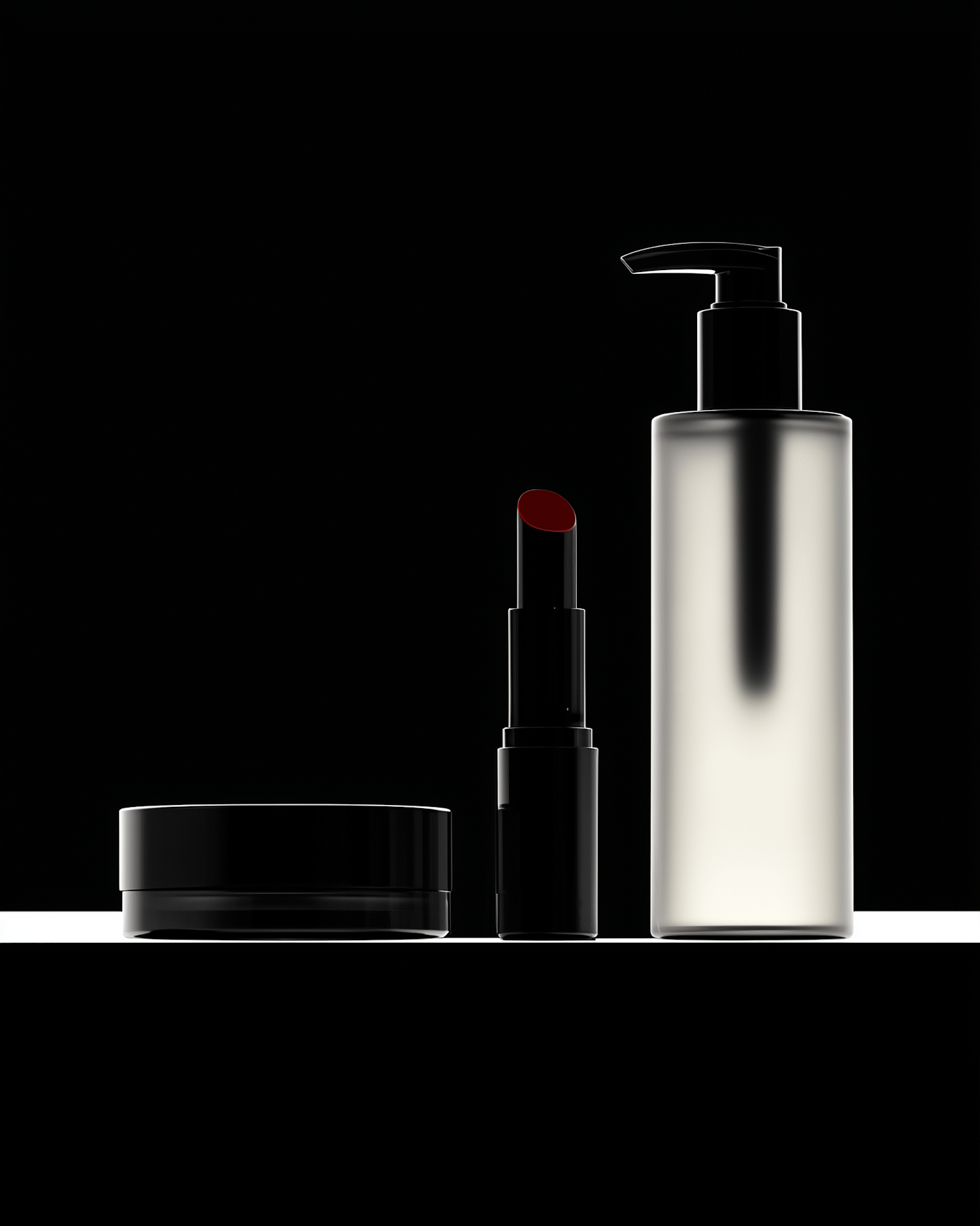Minimalist display of a black container, red lipstick, and pump bottle on a dark background, showcasing sleek and modern cosmetic design.