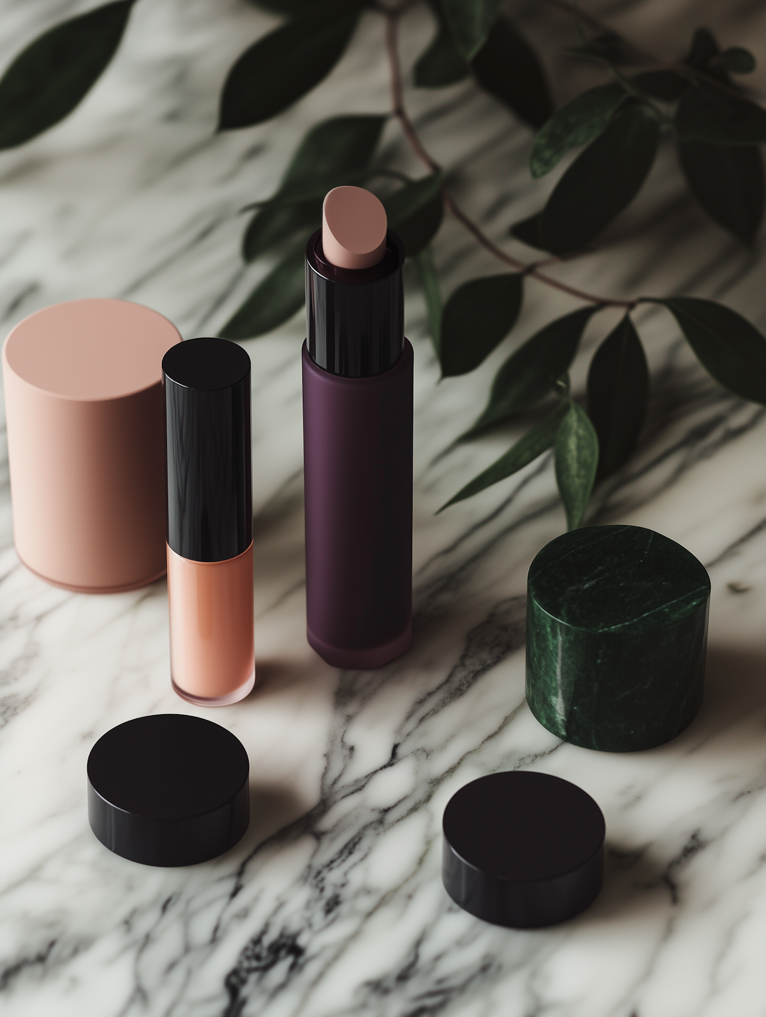 Elegant cosmetics on marble: mauve lipstick, peach concealer, and jars with black and green lids, accented by lush green leaves.